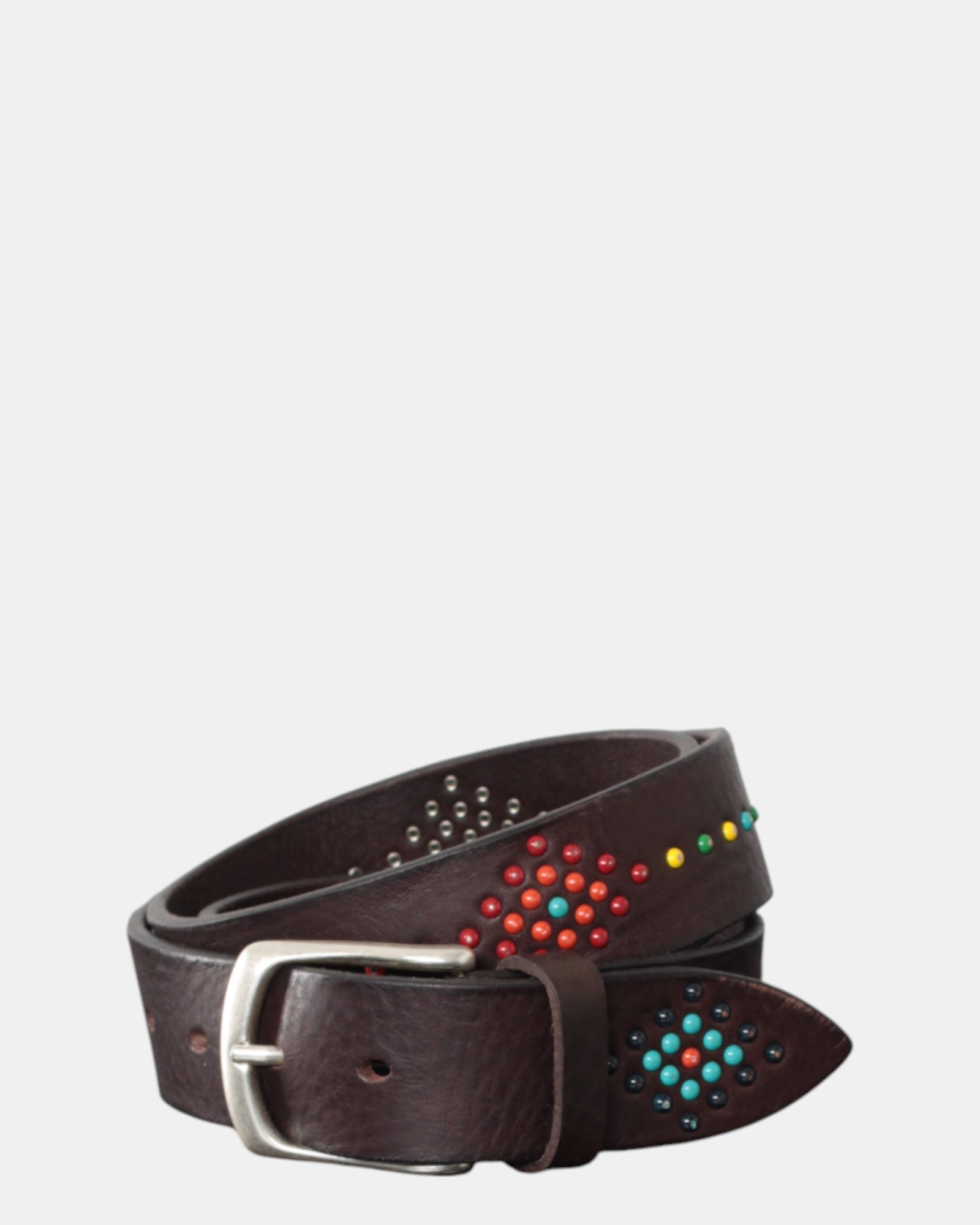 La cintura in pelle di Alberto Luti presenta fantasia borchiata e composizione in pelle, con chiusura con fibbietta in argento