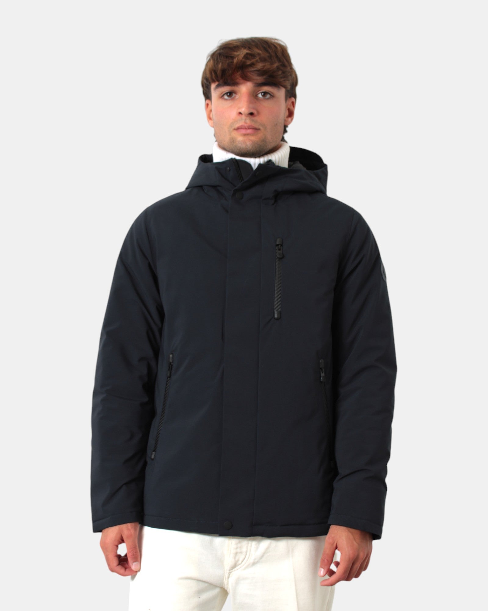 Die Kapuzenjacke AKORE von People of Shibuya besteht aus Gore-Tex-Gewebe mit isolierender technischer Polsterung, hat einen Zweiwege-Reißverschluss und eine Hauptreißverschlussabdeckung mit Knopfverschluss, einen Innenkragen mit spezieller Anti-Pilling-Rippung, Bündchen mit Neopren-Gummizug, Außentaschen mit Verschluss, Außenzusammensetzung 100 % Polyester und Innenpolsterung 100 % Polyester. Wir empfehlen eine Wäsche bei maximal 30 Grad. Das Model ist 1,79 m groß und trägt Größe 44