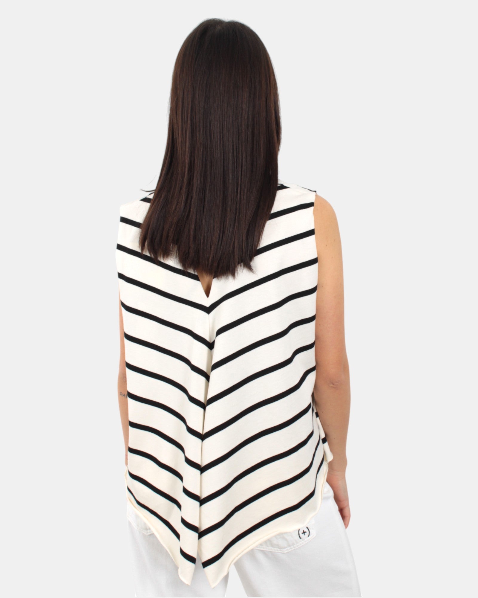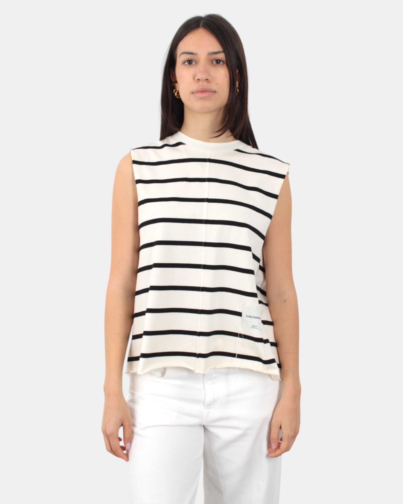 La canotta di Jei-o presenta fantasia a righe orizzontali a contrasto, spacco a V sul retro, dalla mano fresca dovuta alla sua composizione in 100% cotone. Si consiglia lavaggio a mano. La modella è alta 1,68 m e indossa una S