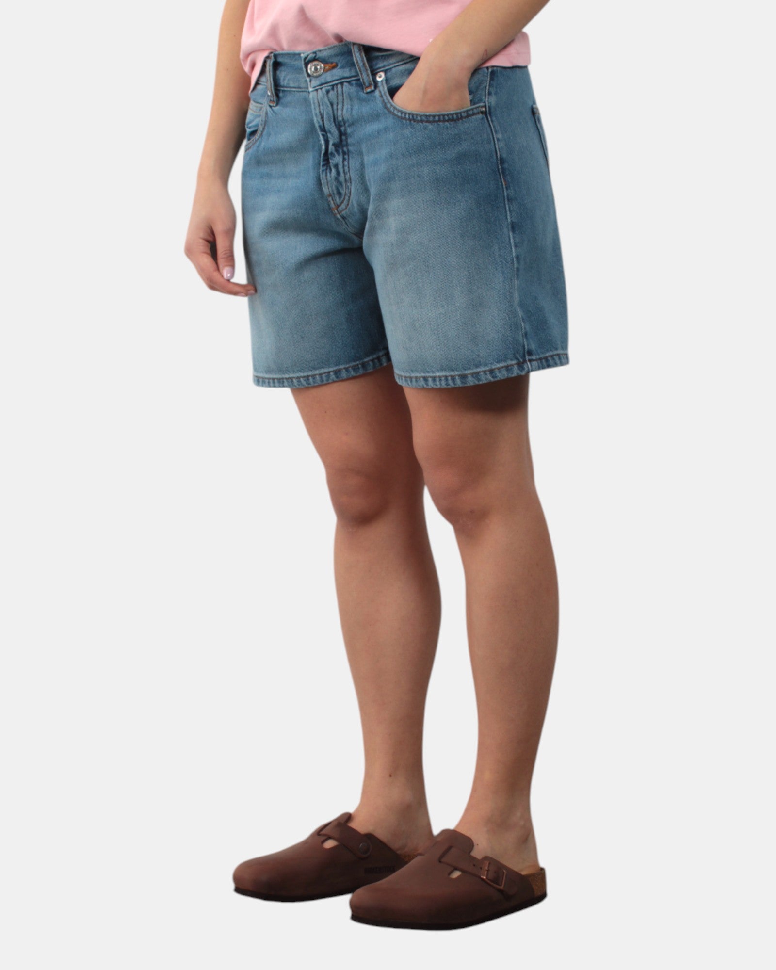 il bermuda a jeans di Roy Roger's presenta chiusura a bottoni, tasche frontali e sul retro. Dalla mano fresca dovuta alla sua composizione in 70% cotone e 30% lyocell. La modella è alta 1,68 m e indossa una 27
