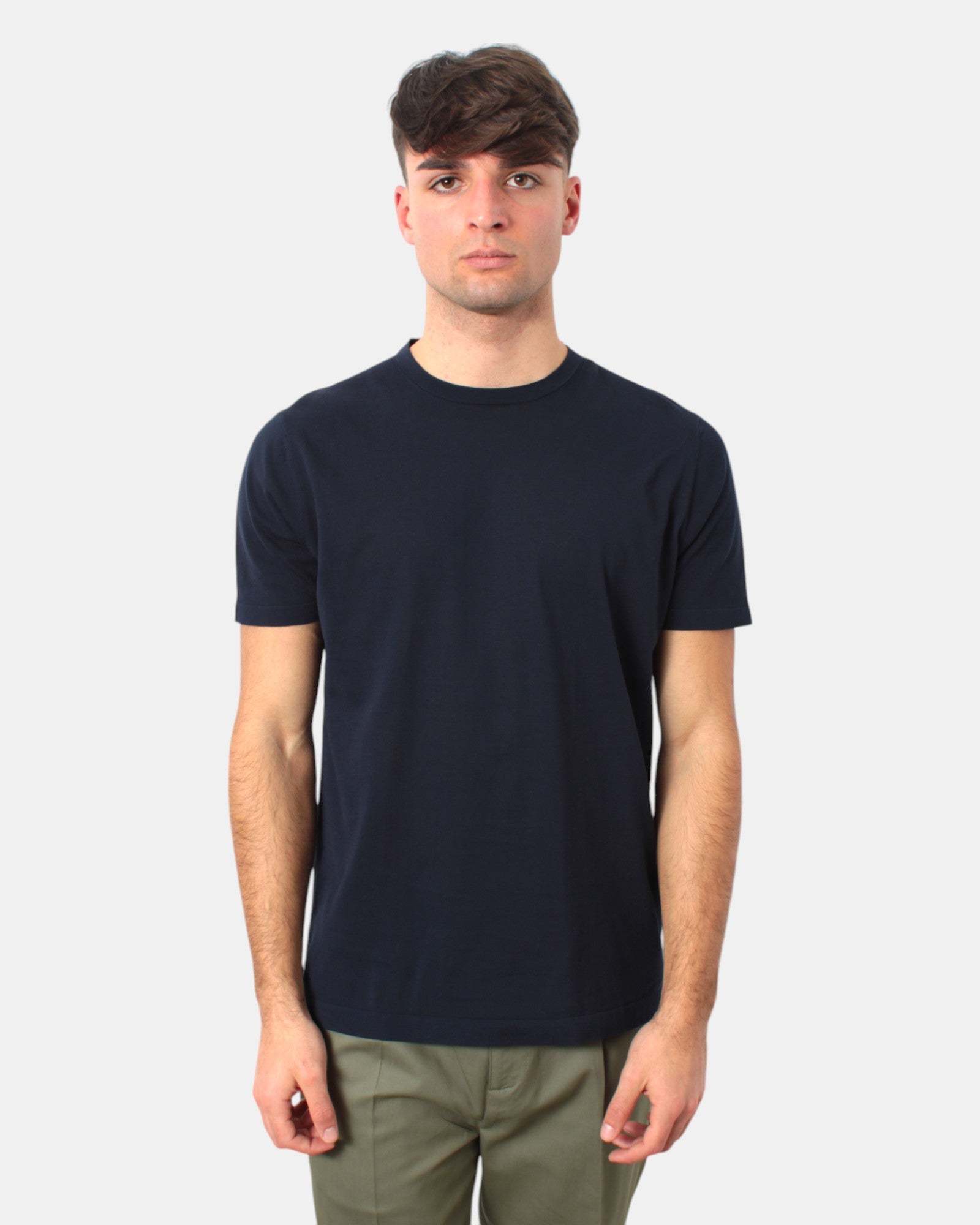 La maglia a maniche corte fantasia monocolore di Kangra presenta mano fresca e morbida dovuta alla sua composizione in 100% cotone, si consiglia lavaggio a mano. Il modello è alto 1,78 m e indossa una 48