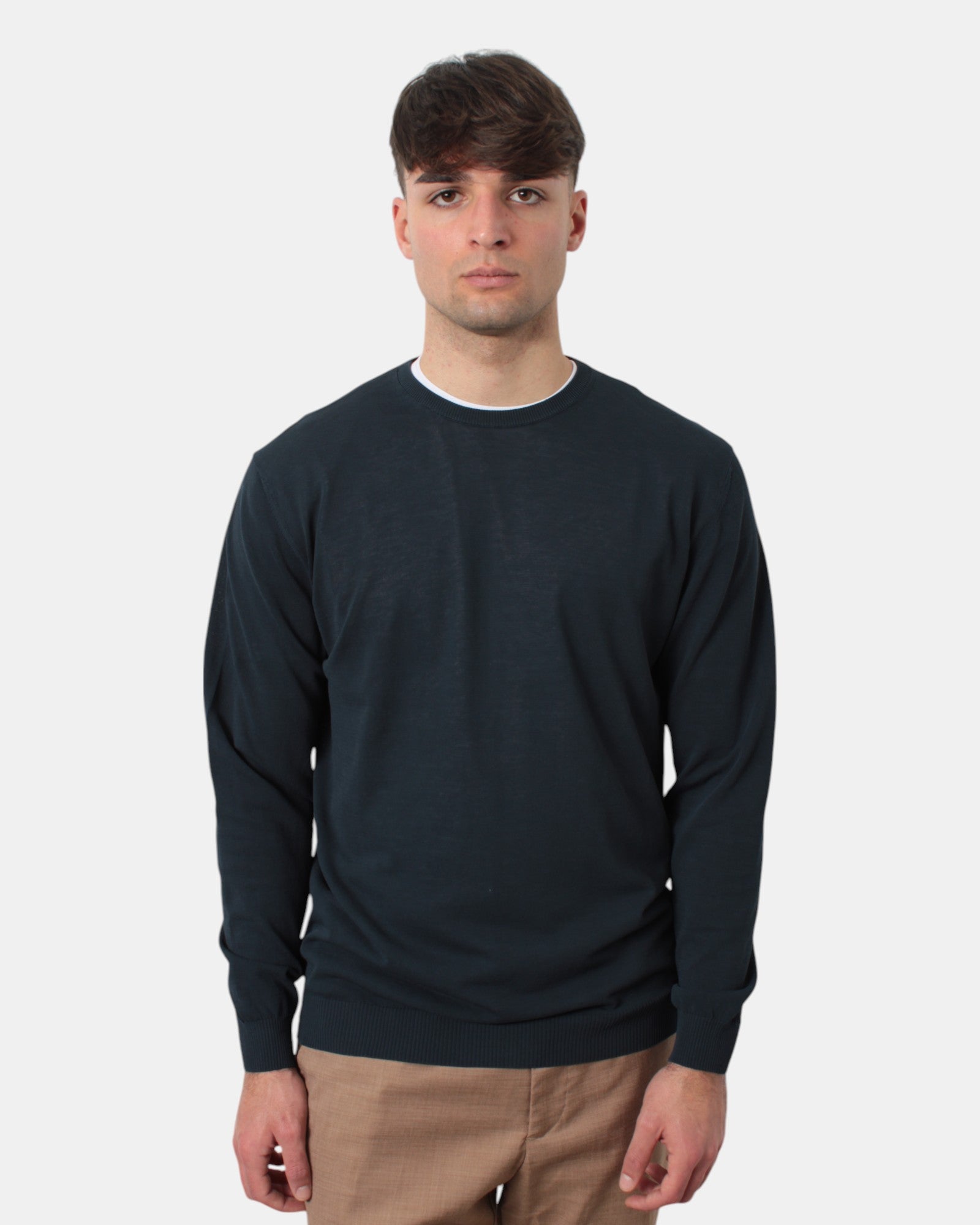 La maglia a girocollo di Daniele Fiesoli presenta fantasia monocolore, collo, fondo e polsi a costine, dalla mano fresca e morbida dovuta alla sua composizione in 100% cotone . Si consiglia il lavaggio a mano. Il modello è alto 1,78 m e indossa una L