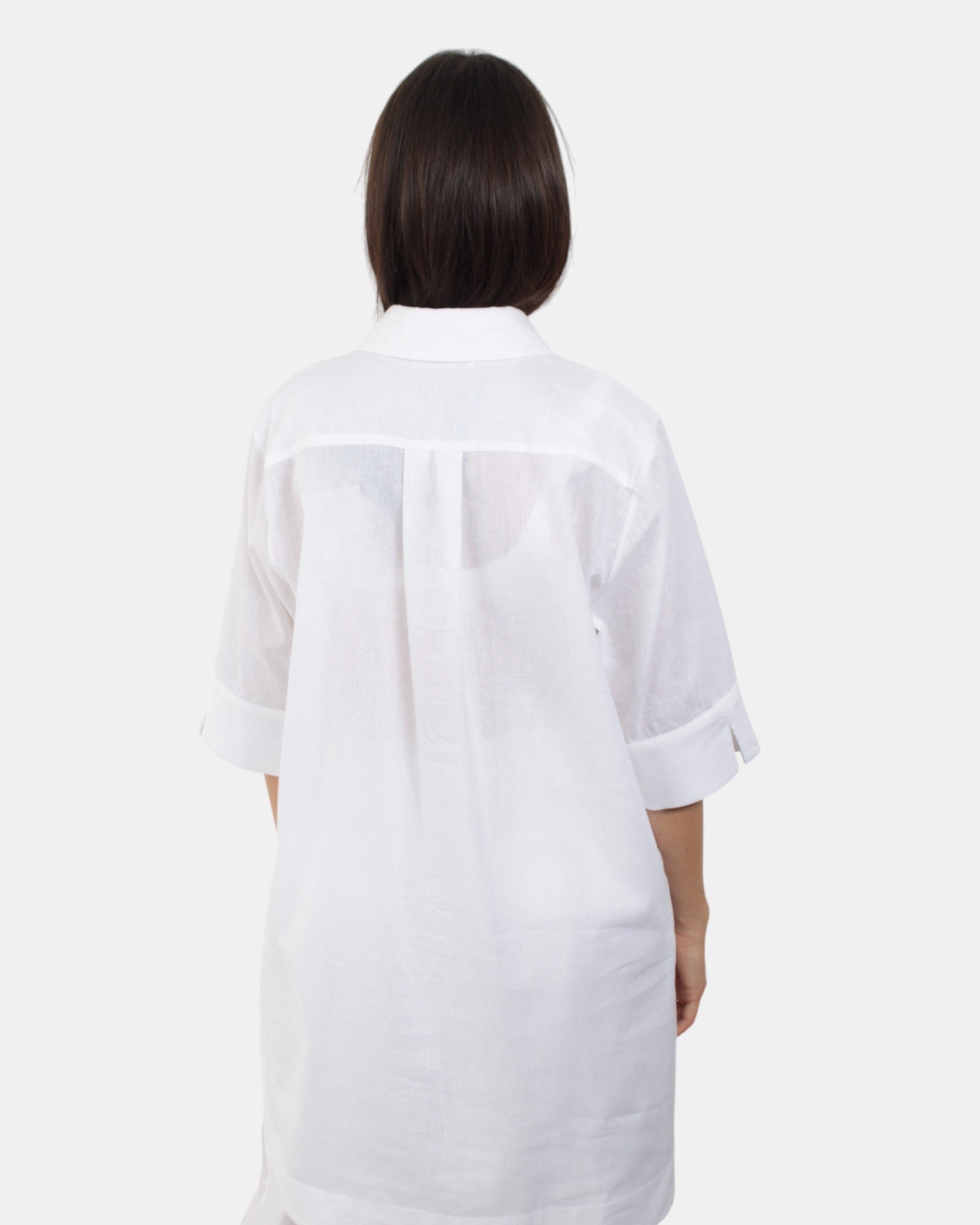 Camicia di Jijil, presenta una linea lunga e morbida, chiusura con bottoni, maniche corte e colletto. Composizione in 55% lino e 45% cotone. Si consiglia lavaggio a massimo 30 gradi. La modella è alta 1,68 m e indossa una 40.