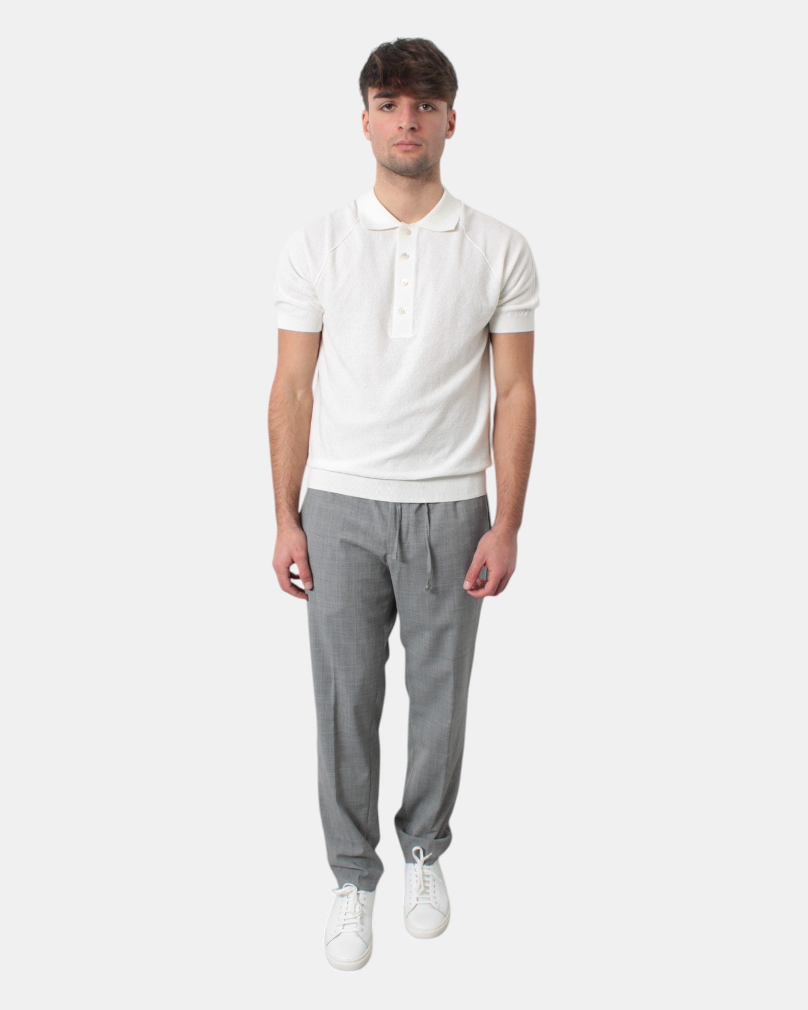 Il pantalone con elastico e coulisse di Michele Carbone presenta tasche frontali, due tasche a filetto sul retro, dalla mano morbida e fresca dovuta alla sua composizione in 54% poliestere, 44% lana 2% elastan. Si consiglia il lavaggio a bassa temperatura. Il modello è alto 1,78 m e indossa una 32