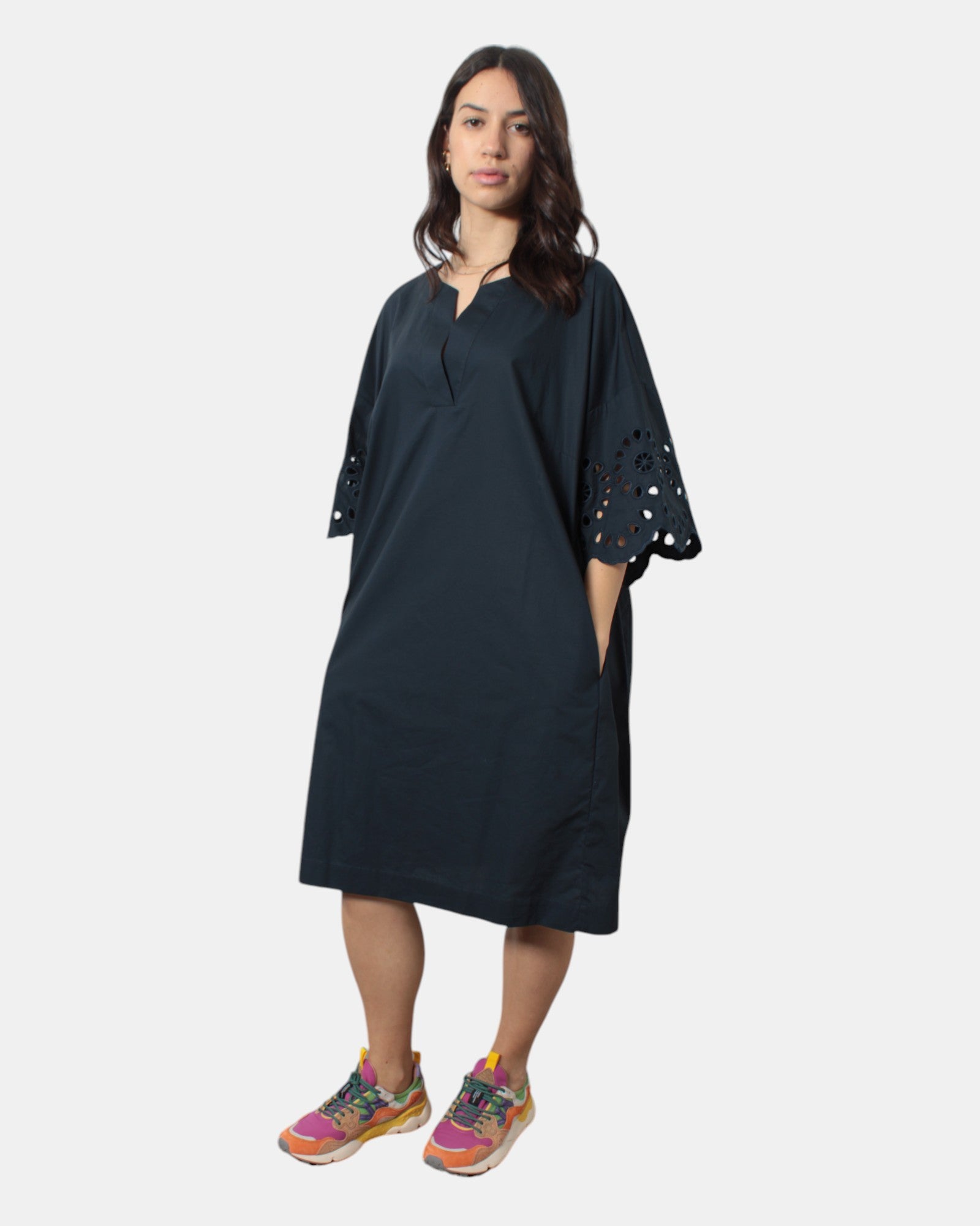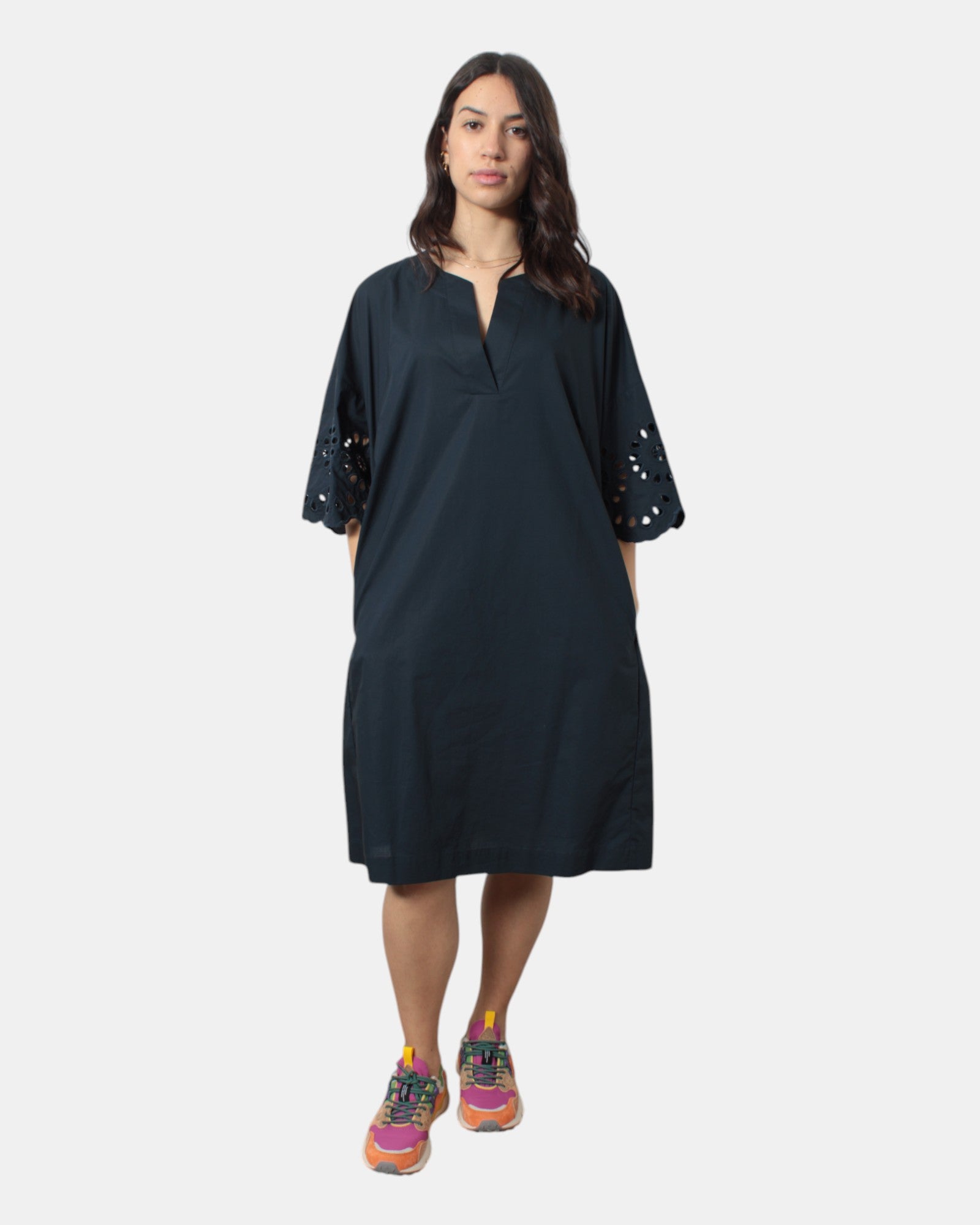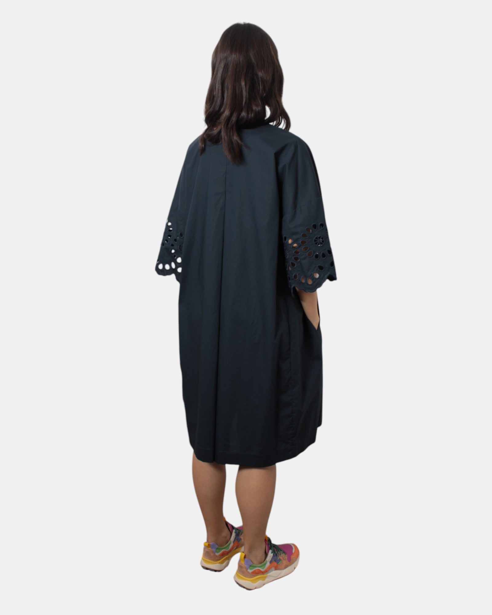 L'abito di Solotre presenta scollo a V, vestibilità ampia, maniche con fantasia forellata brand, dalla mano fresca dovuta alla sua composizione in 100% cotone. SI consiglia lavaggio a massimo 30 gradi. La modella è alta 1,68 m e indossa una 38