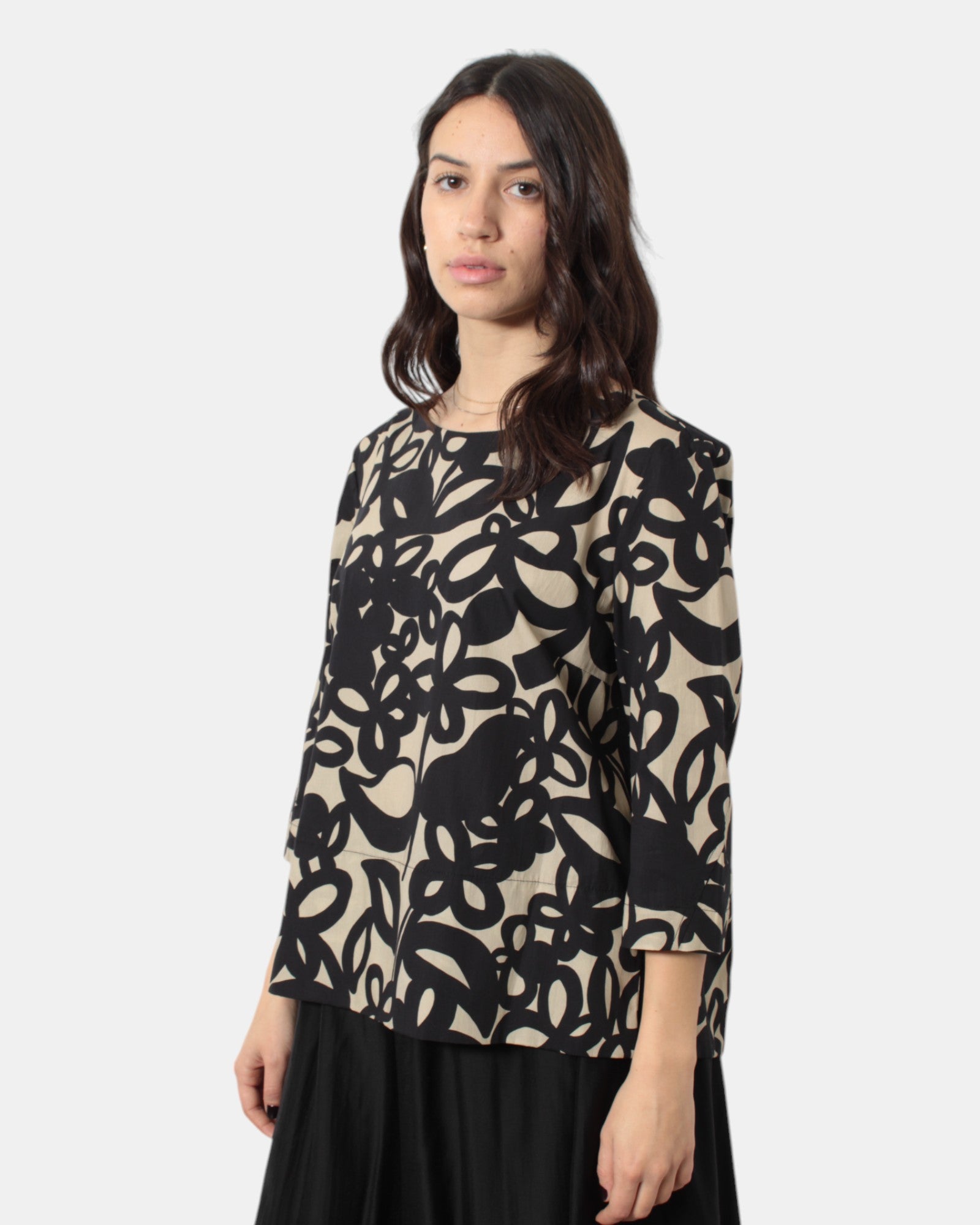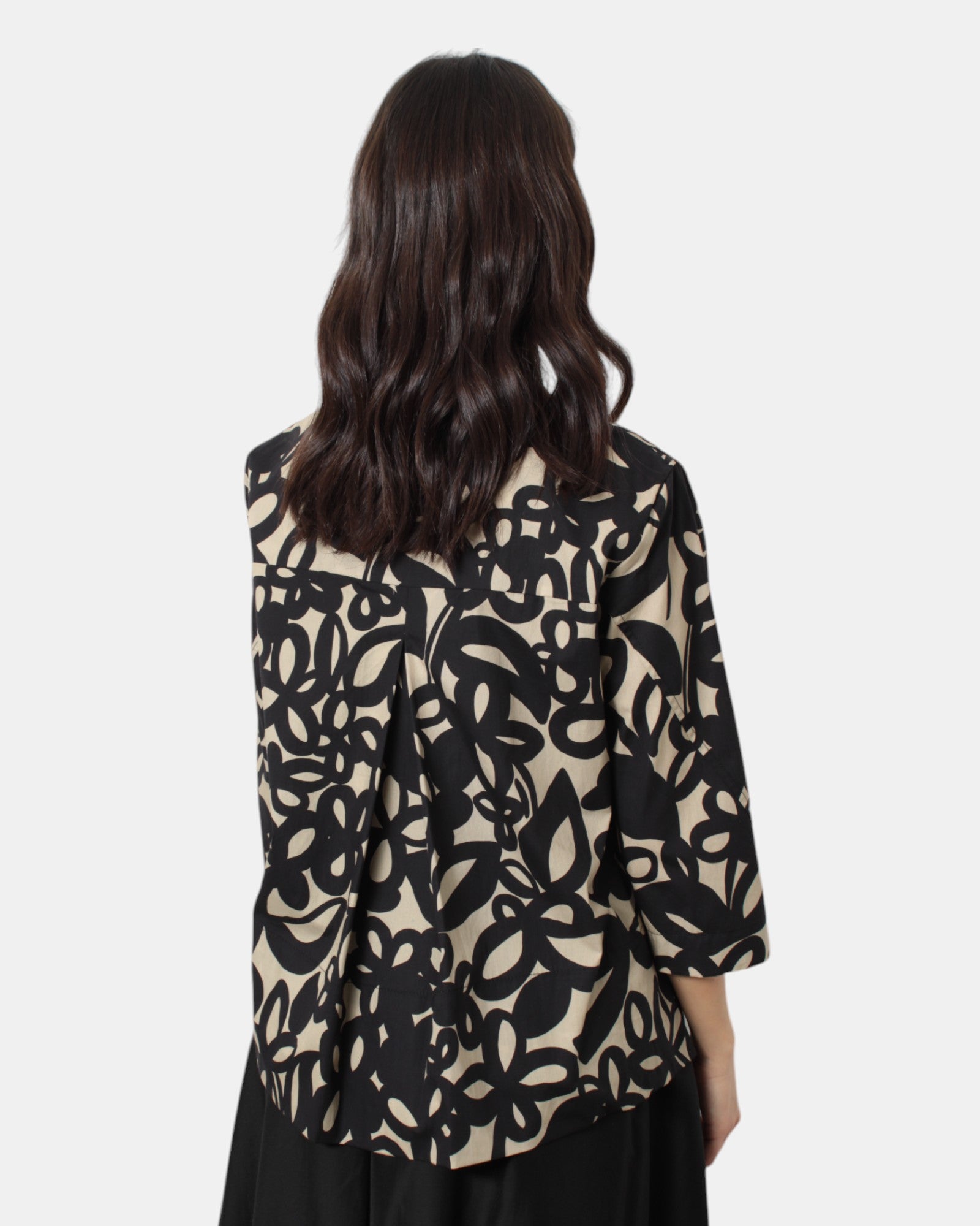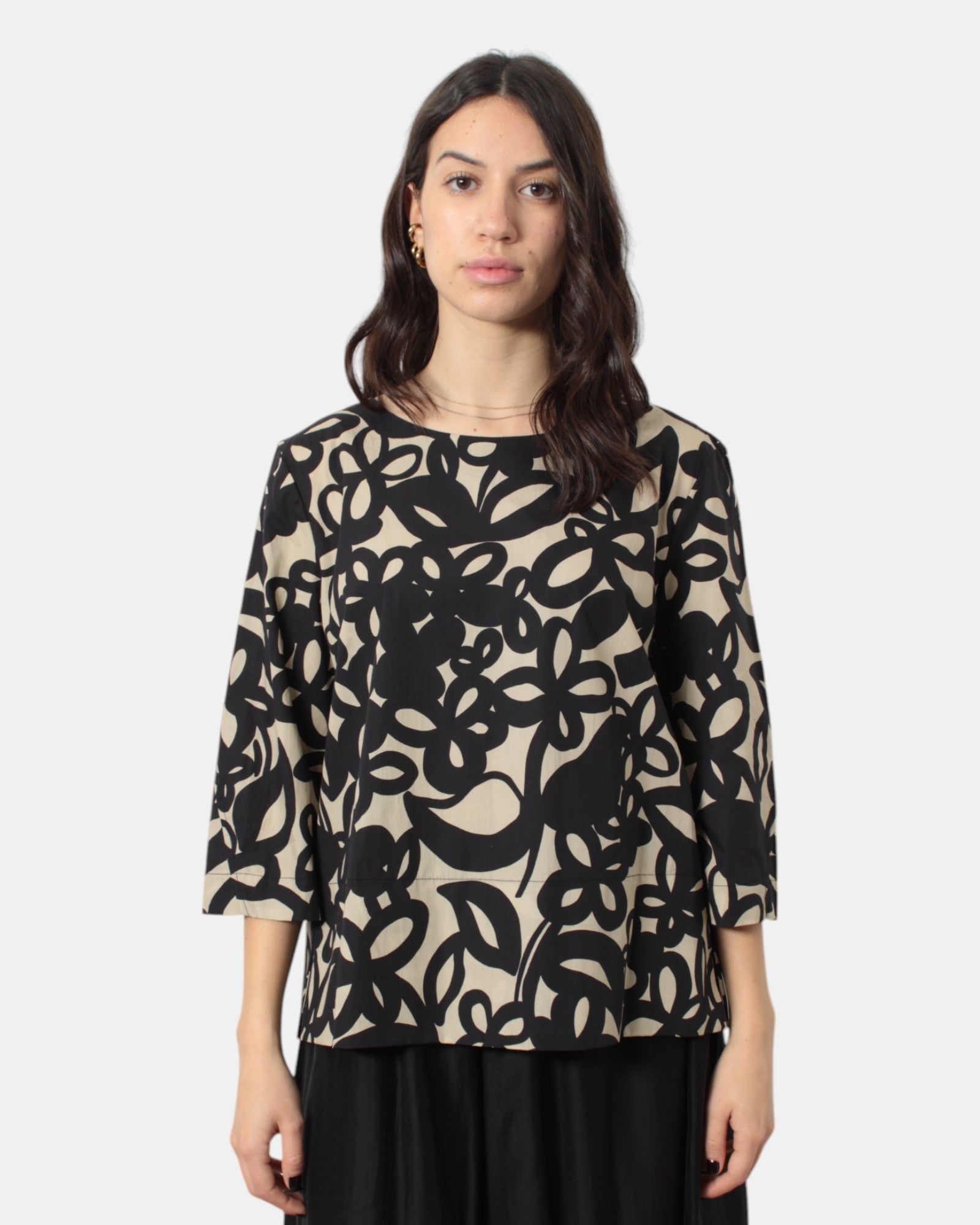La casacca di Meimei j presenta fantasia floreale brand, giro sceso, due spacchetti laterali, dalla mano fresca dovuta alla composizione in 100% cotone, si consiglia lavaggio a massimo 30 gradi. La modella è alta 1,68 m e indossa una 40