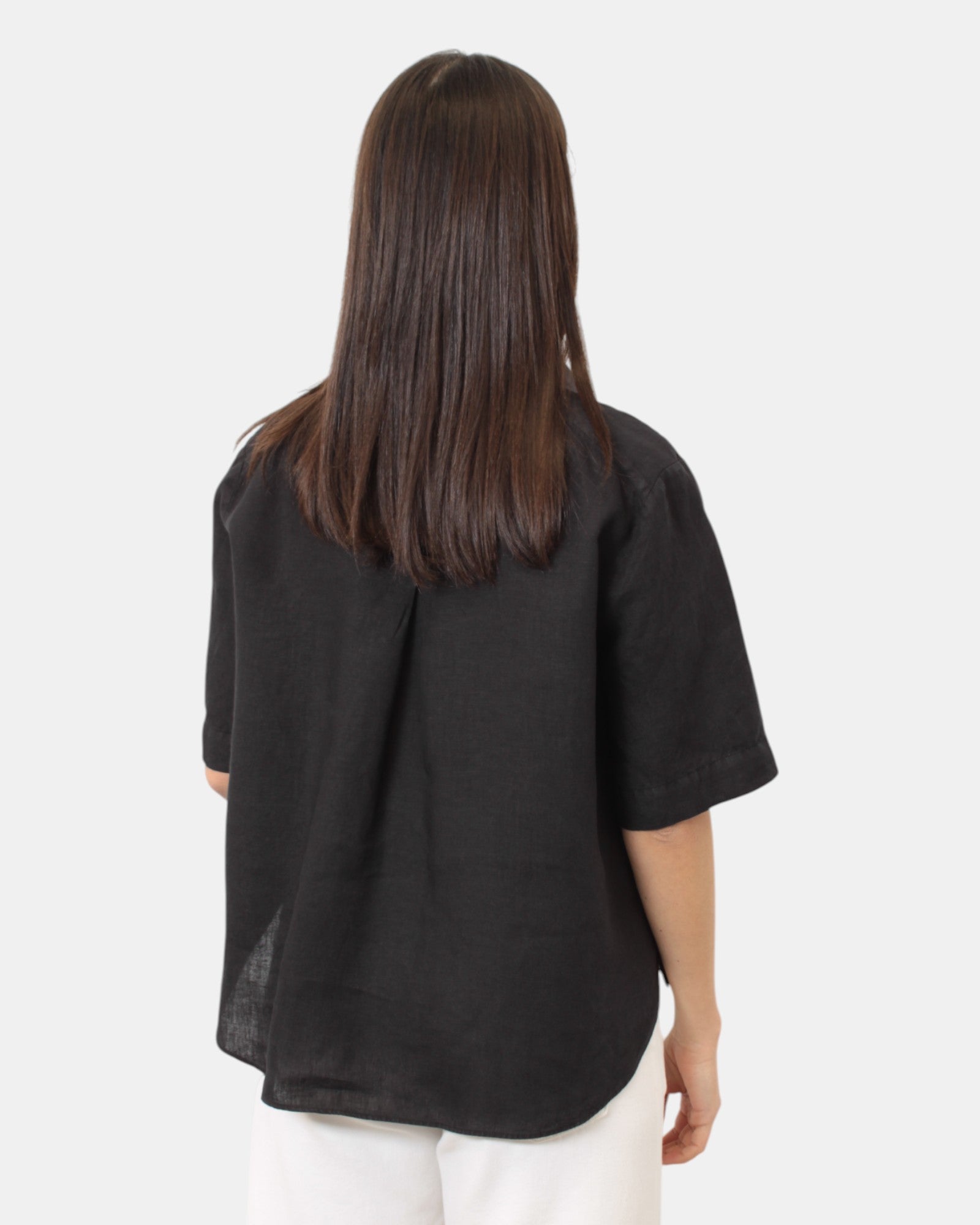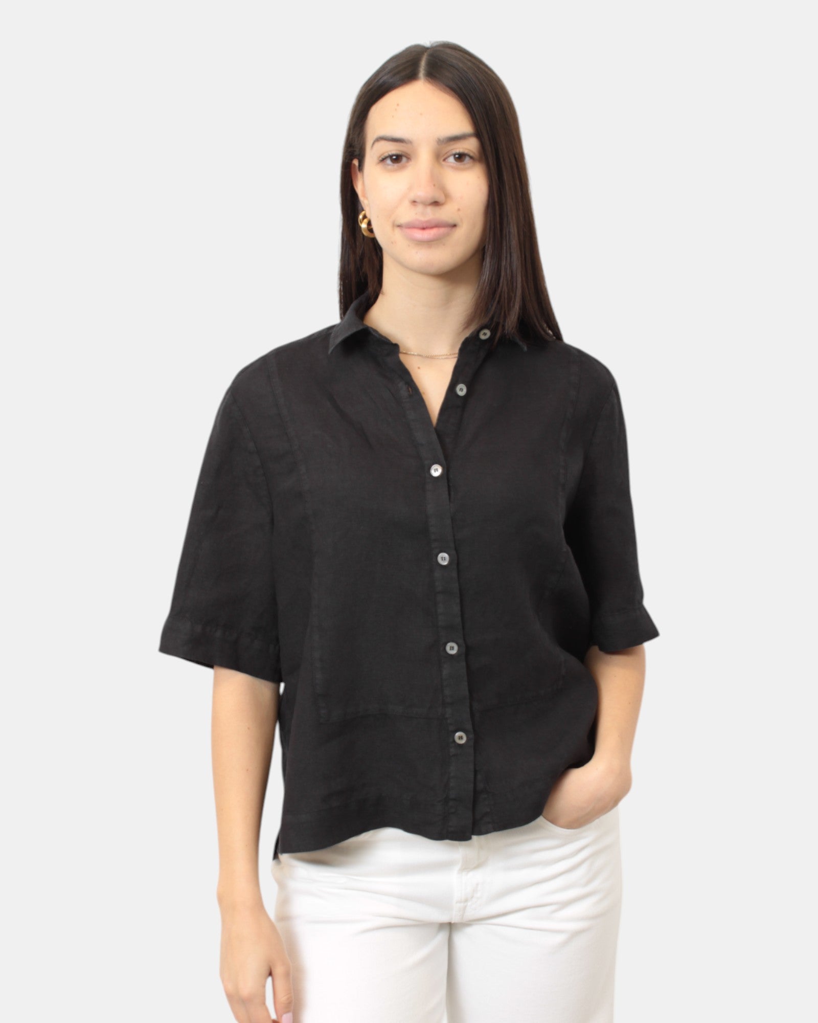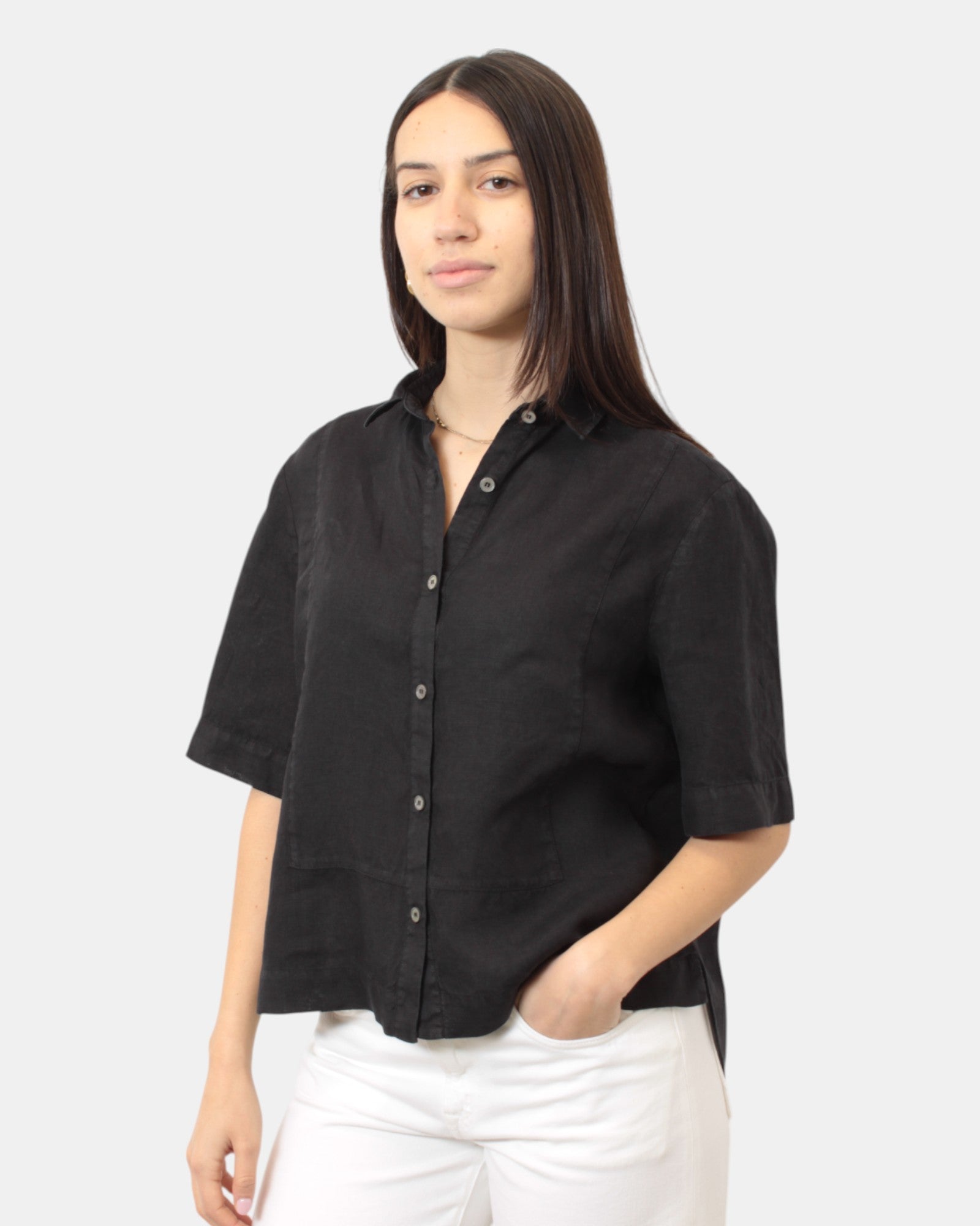 La camicia a maniche corte di Academia presenta chiusura a cinque bottoni, due spacchetti laterali, dalla mano fresca dovuta alla sua composizione in 100% cotone. Si consiglia lavaggio a mano. La modella è alta 1,68 m indossa una S