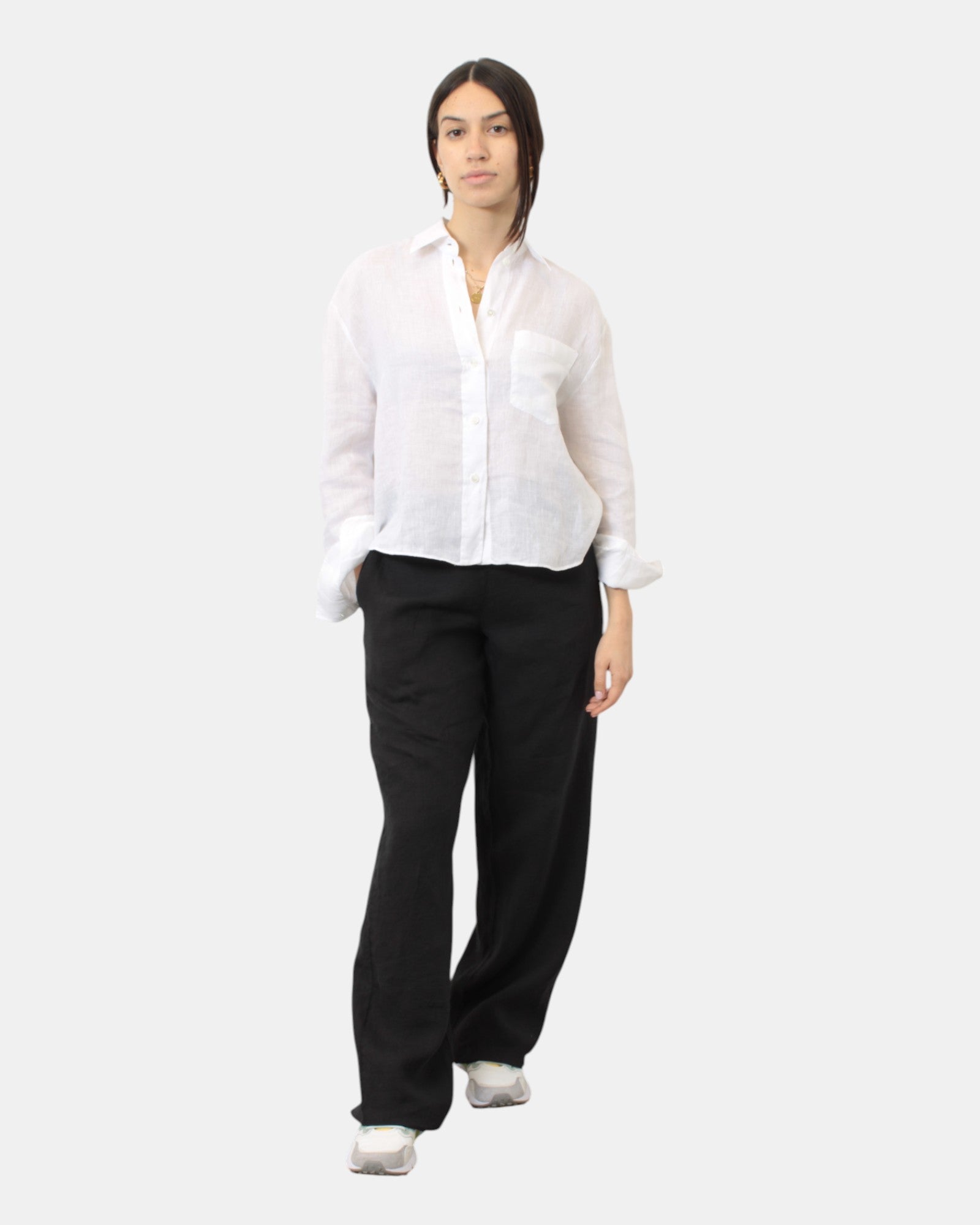 Il pantalone di Academia presenta elastico in vita, vestibilità ampia, tasche frontali, dalla mano soffice e fresca dovuta alla sua composizione in 100% lin. Si consiglia lavaggio a massimo 30 gradi. La modella è alta 1,68 m e indossa una S