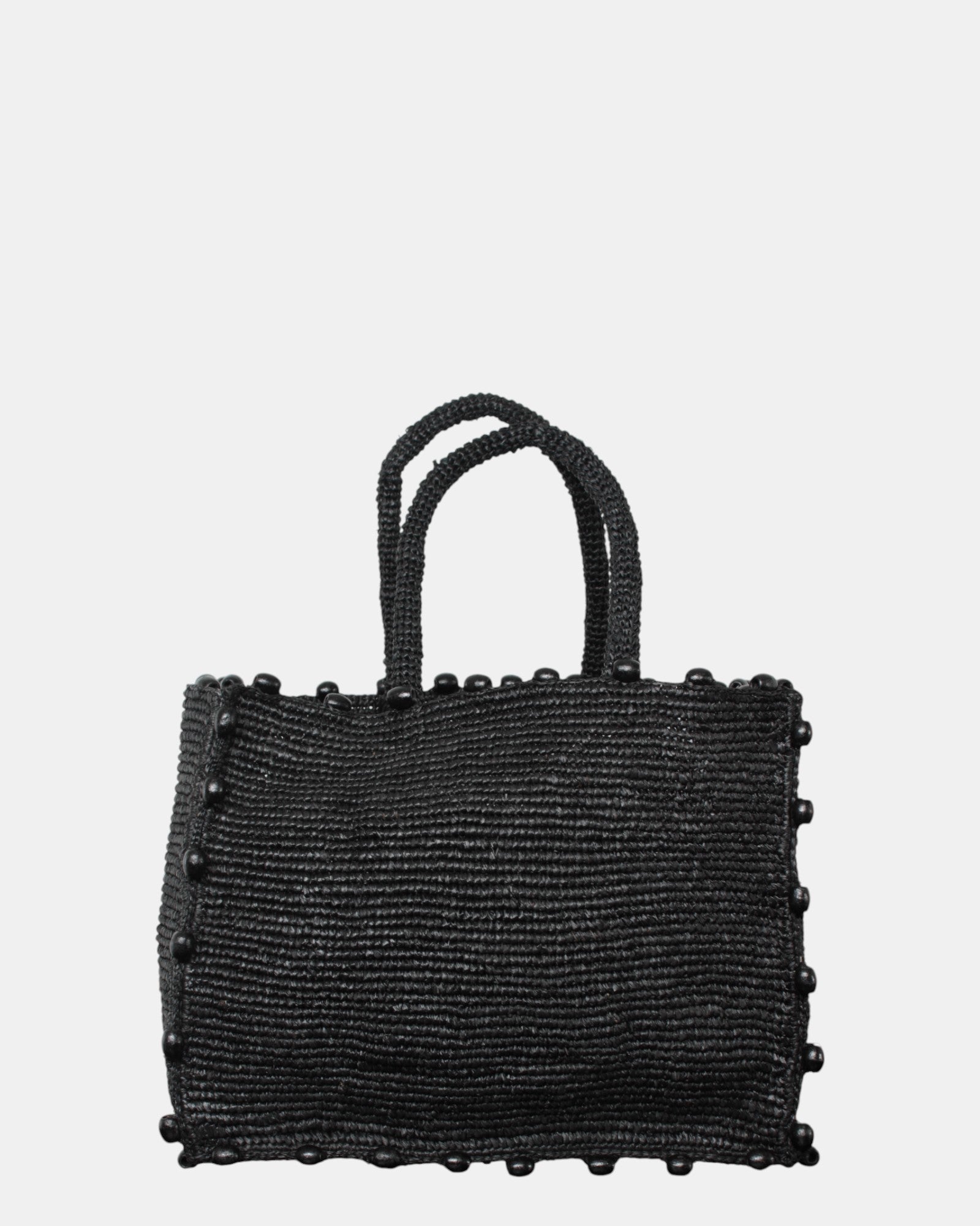 -DETTAGLI: realizzata in autentica rafia con finitura tinta unita marrone, è impreziosita da un elegante dettaglio di perle in legno lungo il perimetro, logo Saint Barth ricamato sul fronte e tasca interna.