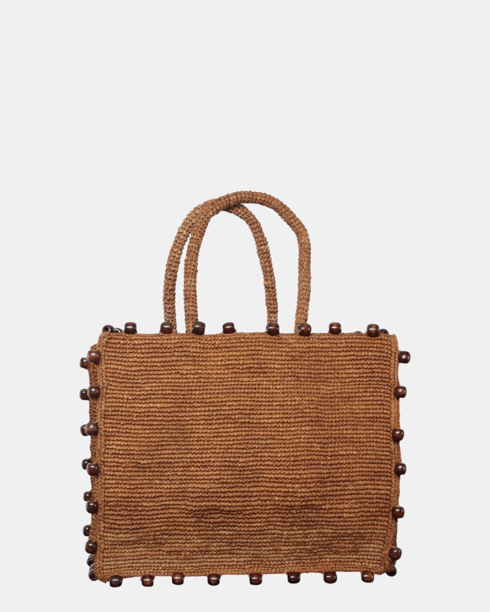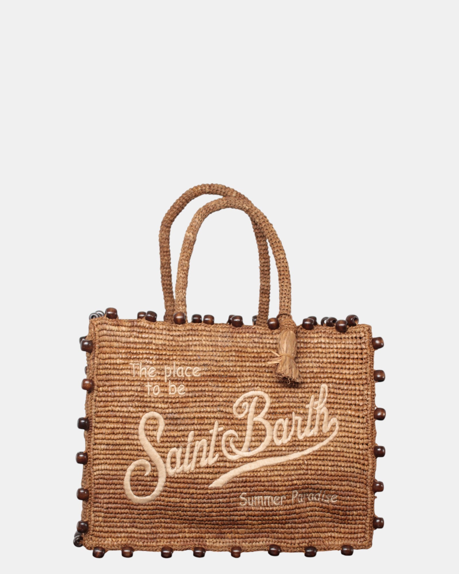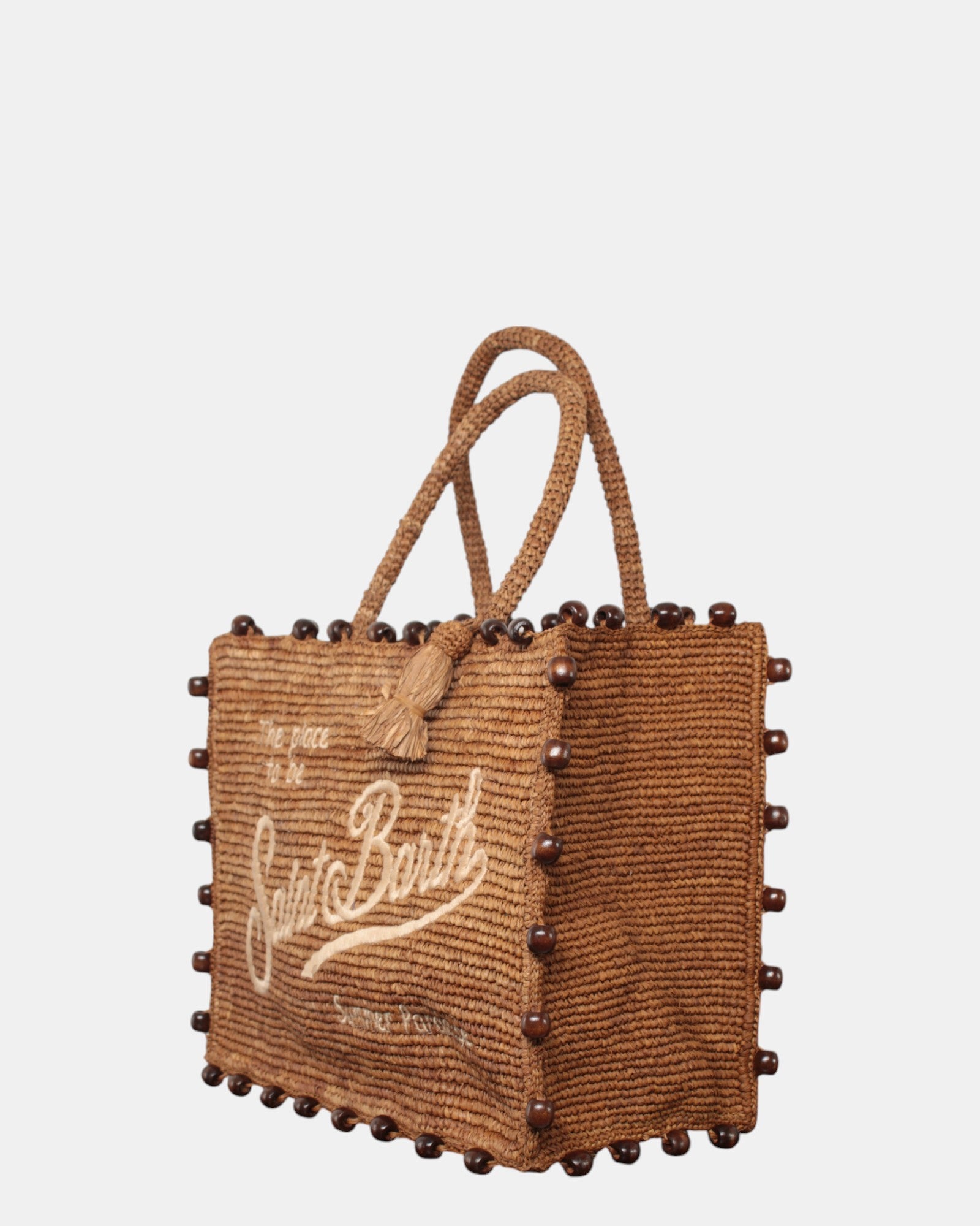 -DETTAGLI: realizzata in autentica rafia con finitura tinta unita marrone, è impreziosita da un elegante dettaglio di perle in legno lungo il perimetro, logo Saint Barth ricamato sul fronte e tasca interna.