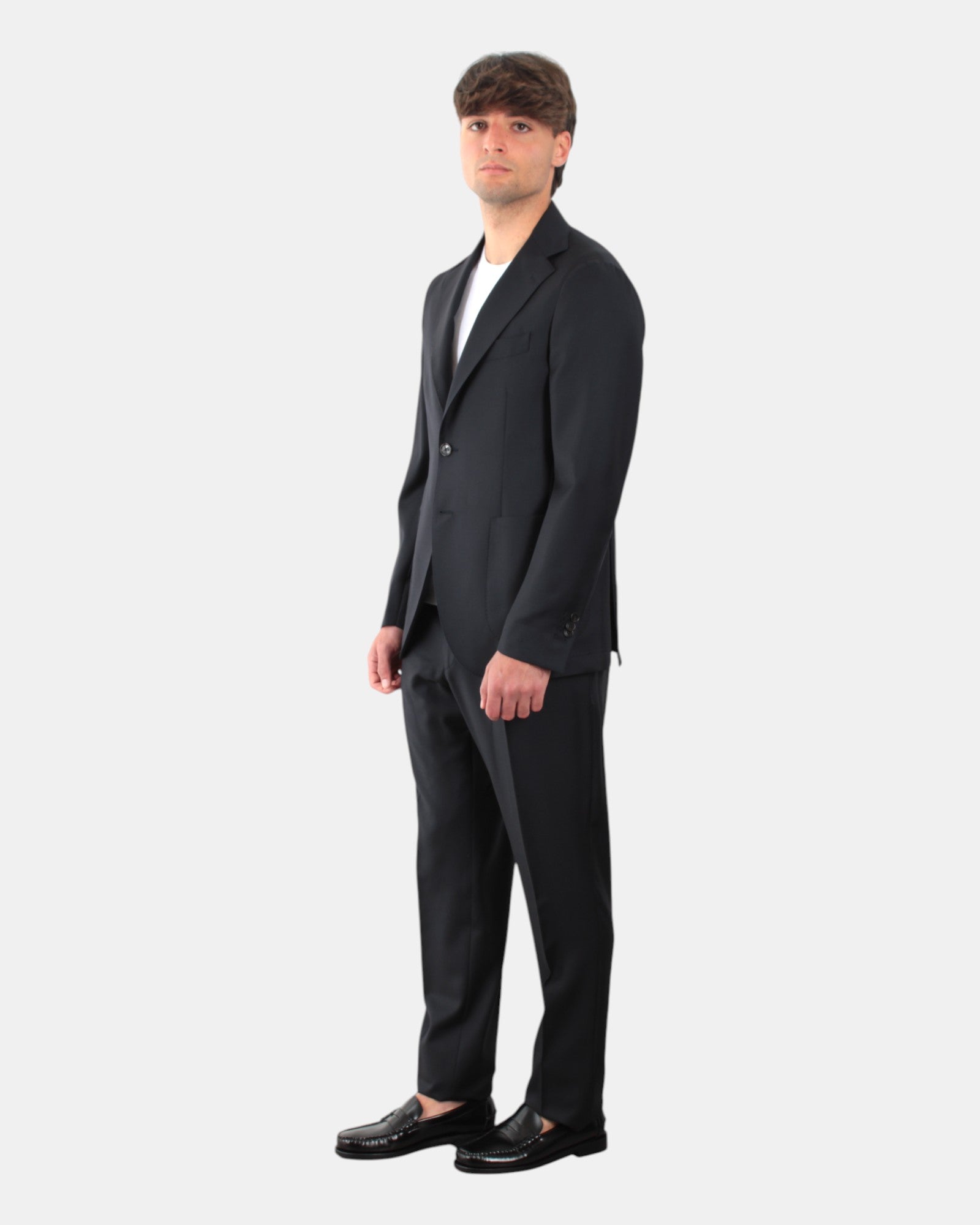 L'abito monopetto di Bollani presenta chiusura a due bottoni, due tasche frontali, taschino sul petto, due spacchi sul retro, dalla mano fresca dovuta alla sua composizione in 100% lana vergine. Il pantalone presenta due tasche frontali, chiusura con bottone e gancetto, sul retro due tasche a filetto. Si consiglia il lavaggio a mano. Il modello è alto 1,78 m e indossa una 50