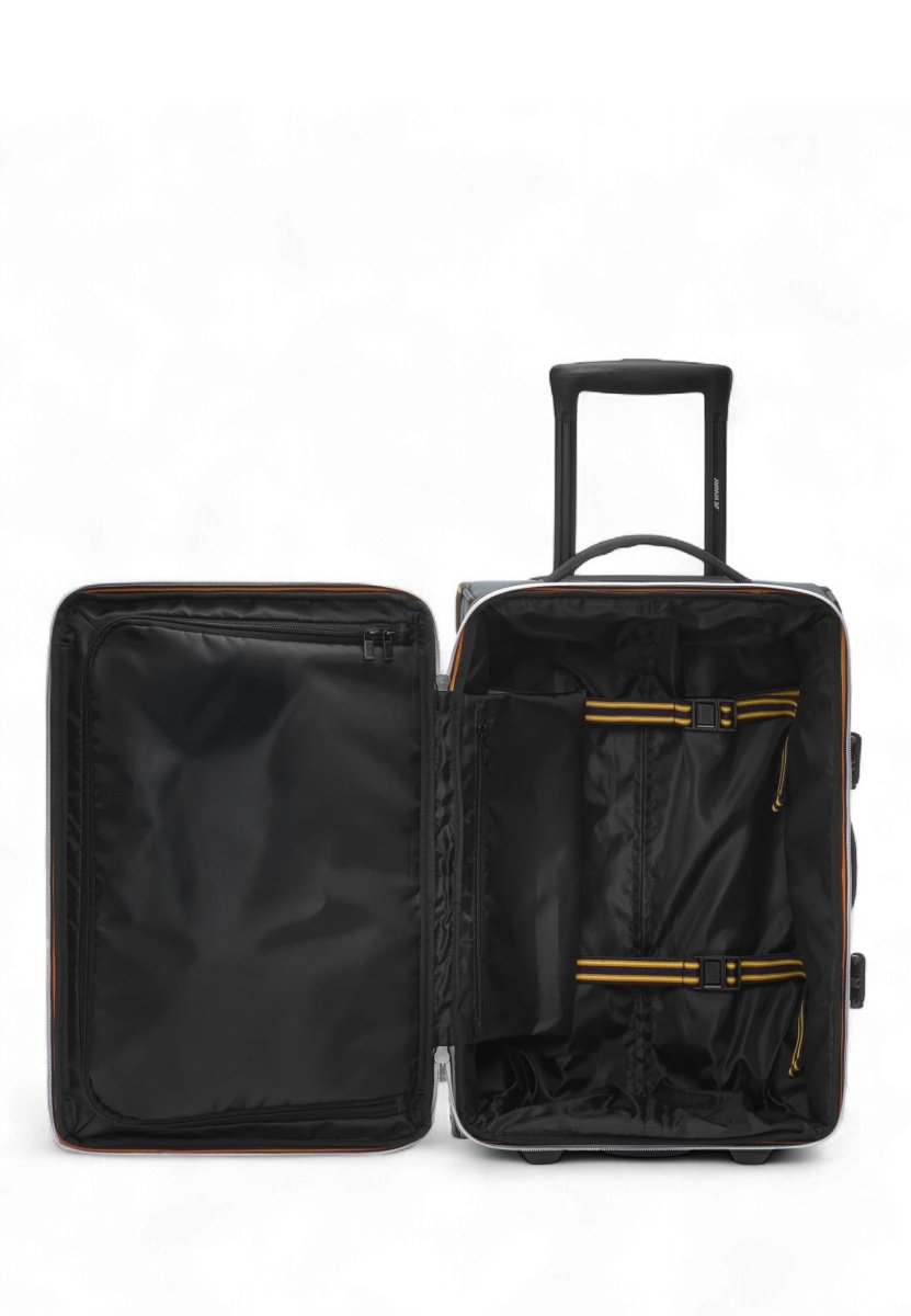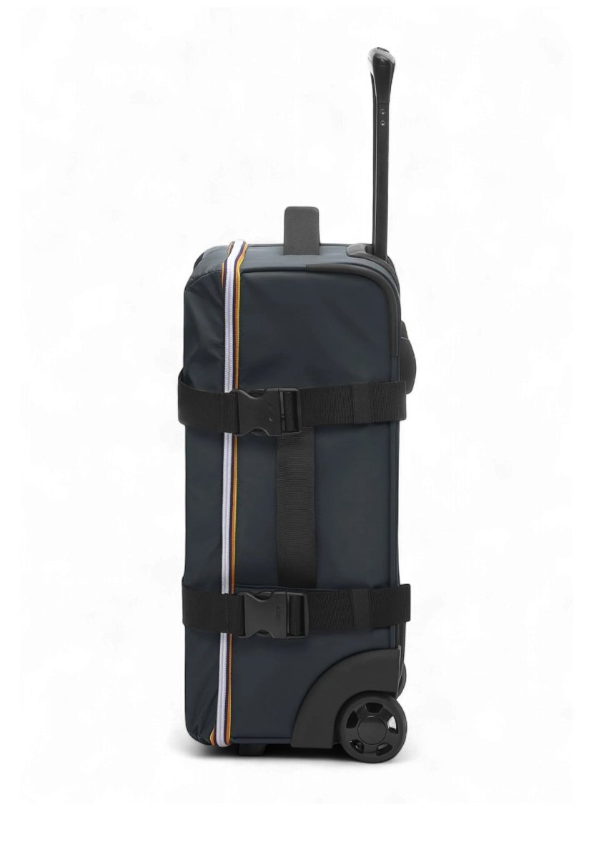 Realizzato in nylon ripstop impermeabile, idrorepellente e antivento, è dotato di base rinforzata per garantire resistenza agli urti e all’usura. Le due ruote posteriori, insieme al manico rigido estraibile, alle maniglie laterale e superiore e alla chiusura con zip K-Way a doppio cursore, offrono un'esperienza di trasporto comoda e versatile.