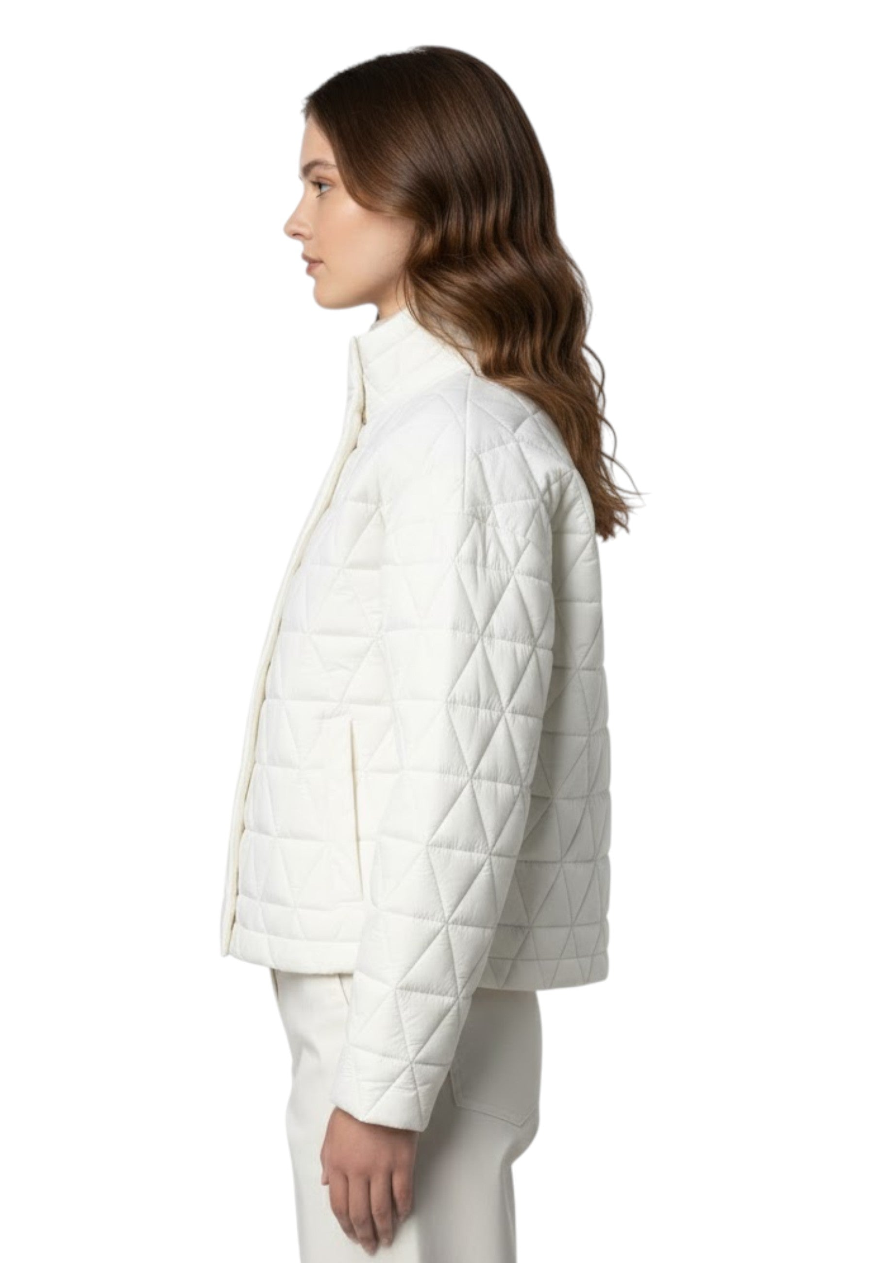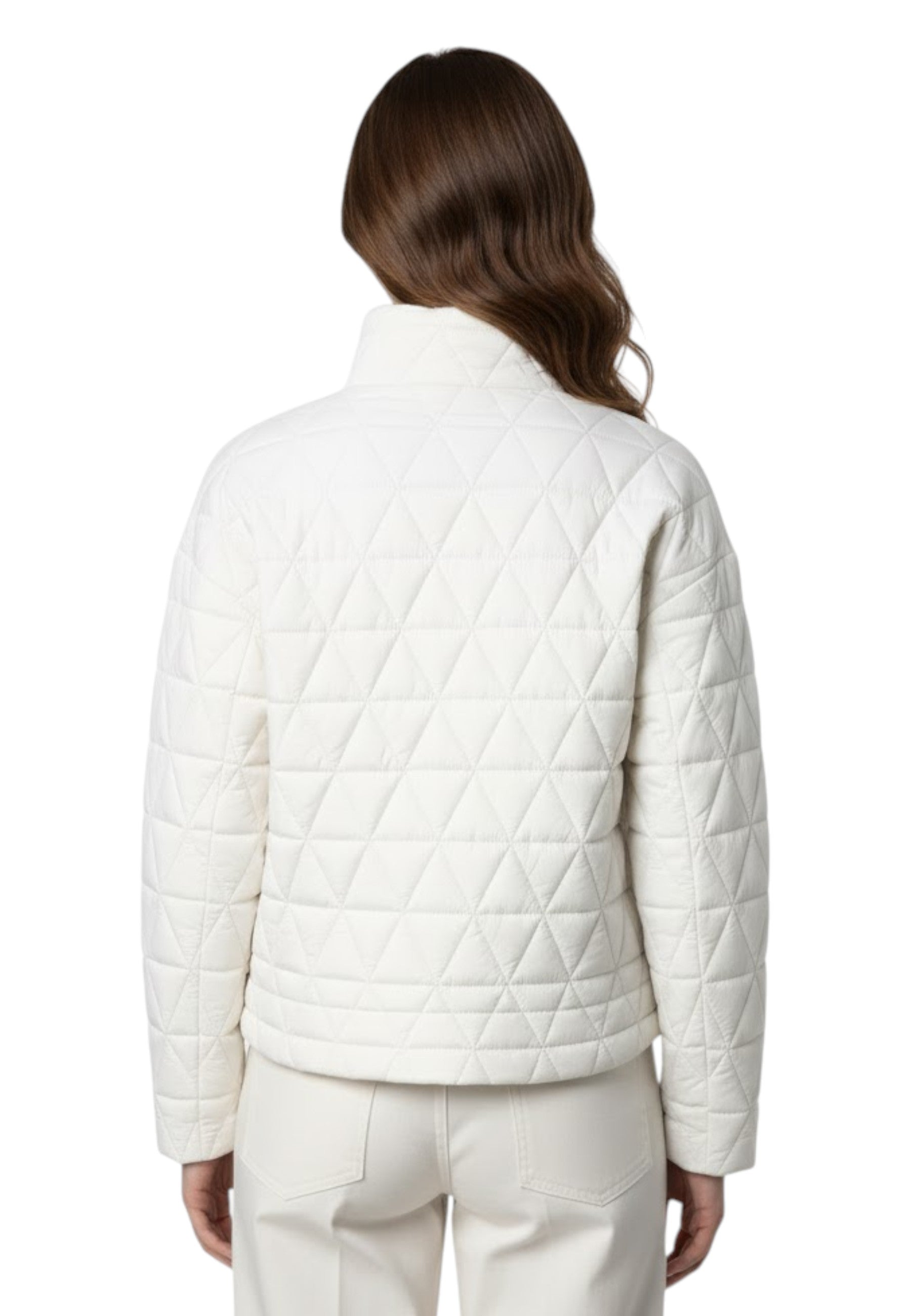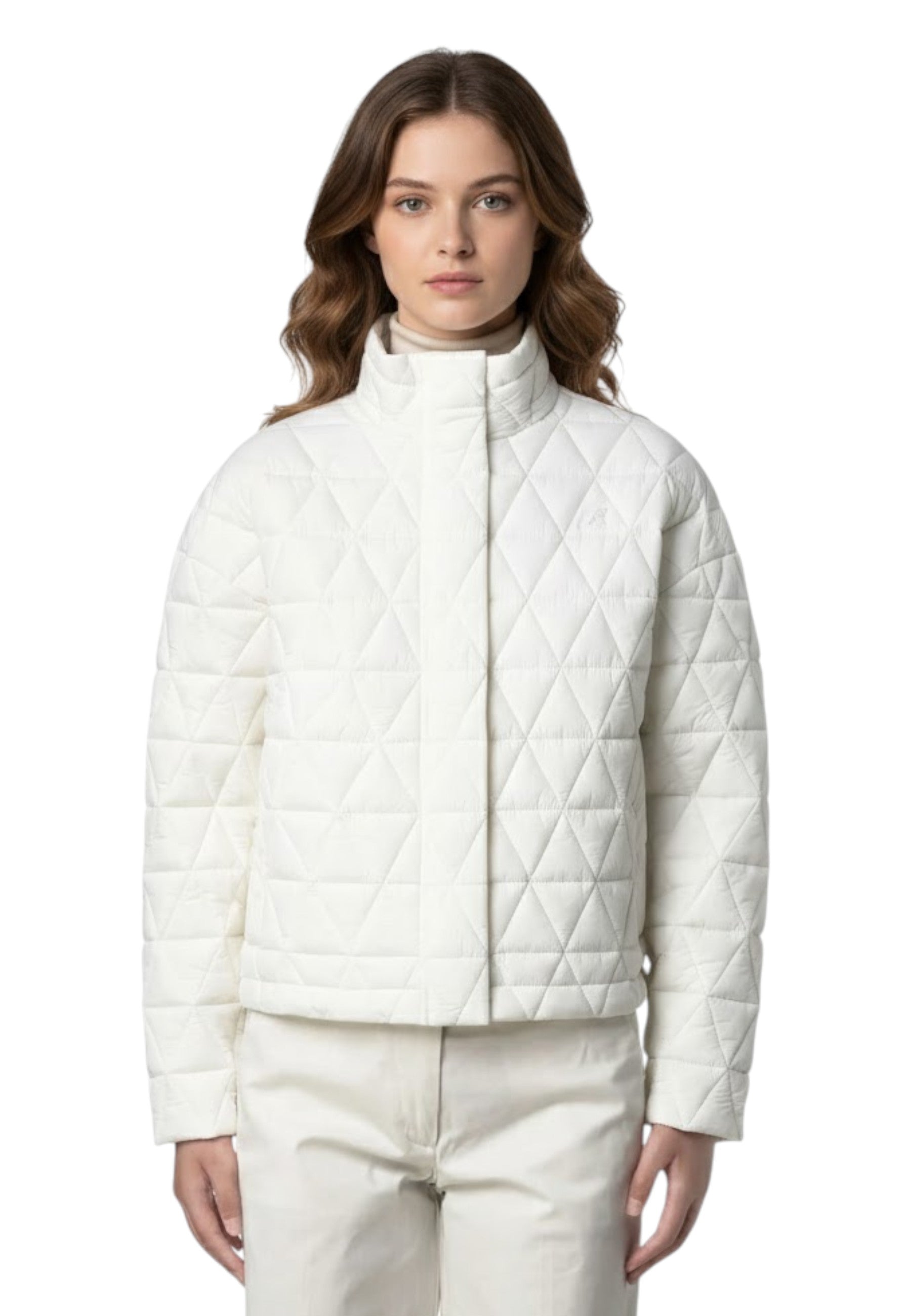 La Sabrina Diamond Quilted Warm - X42 White Gardenia di K-WAY è la giacca corta perfetta per affrontare la mezza stagione con eleganza e funzionalità. Il design femminile e moderno, con fondo dritto e trapuntatura a triangoli, dona al capo un look pulito e raffinato, ideale per un uso quotidiano versatile.
