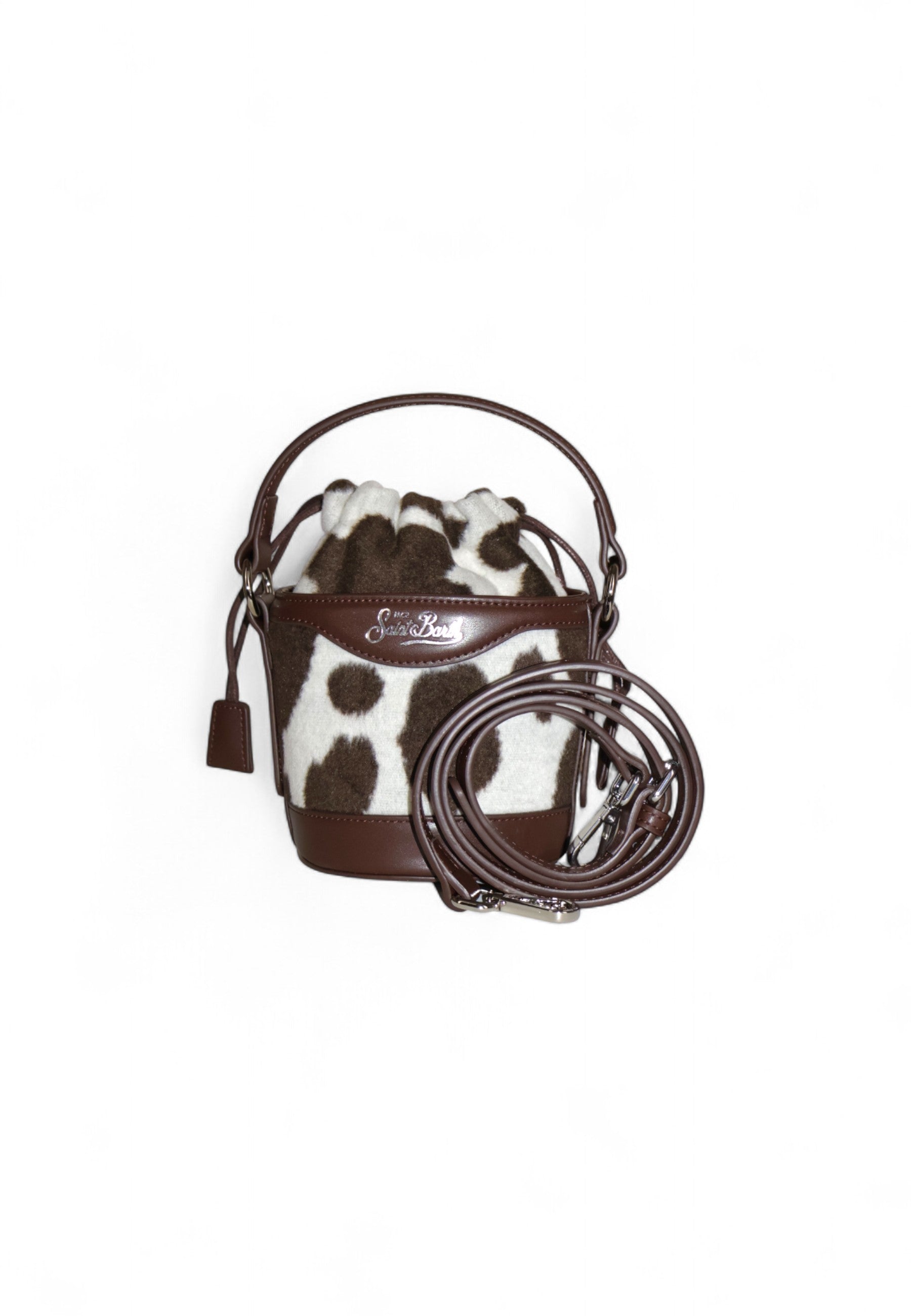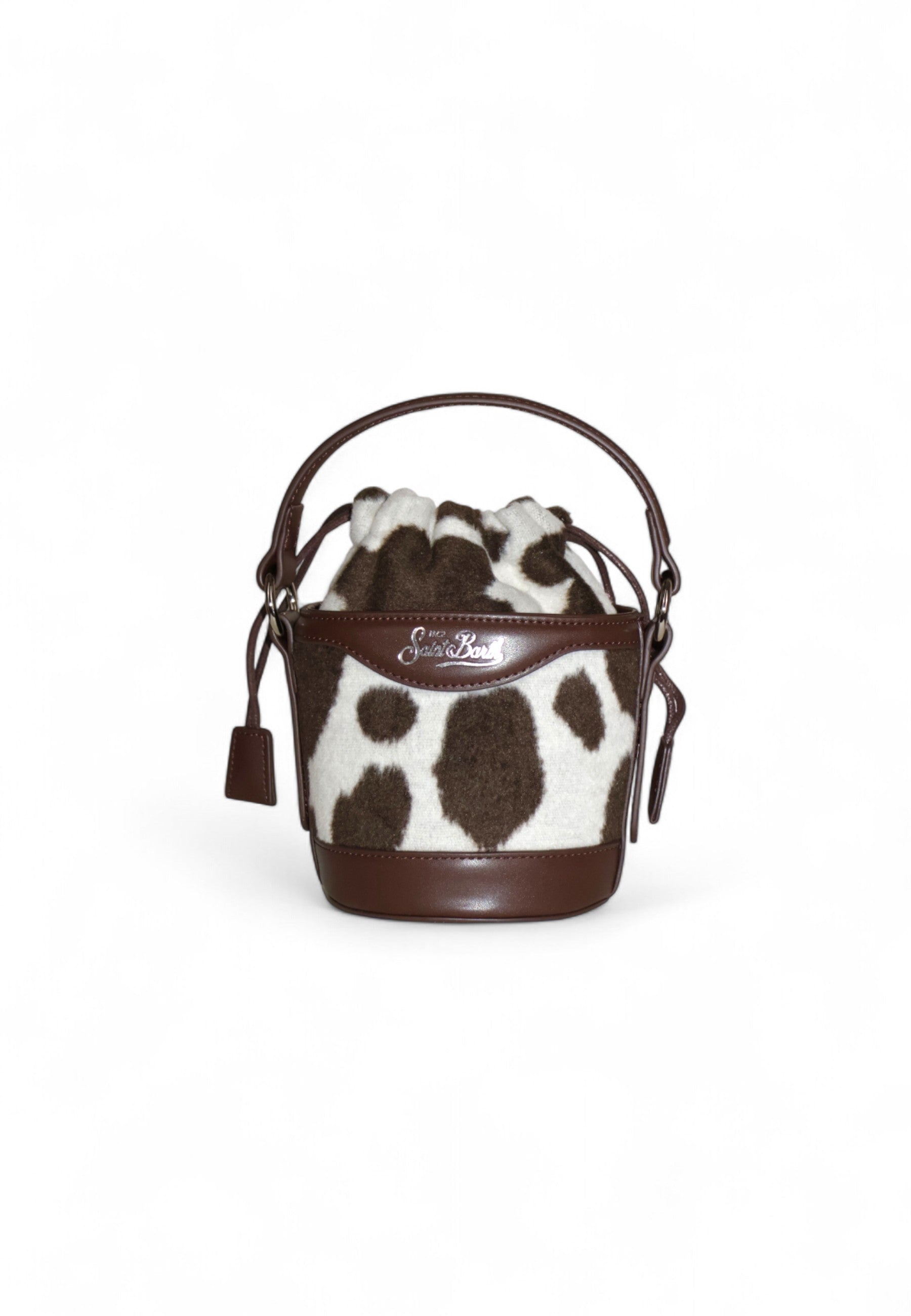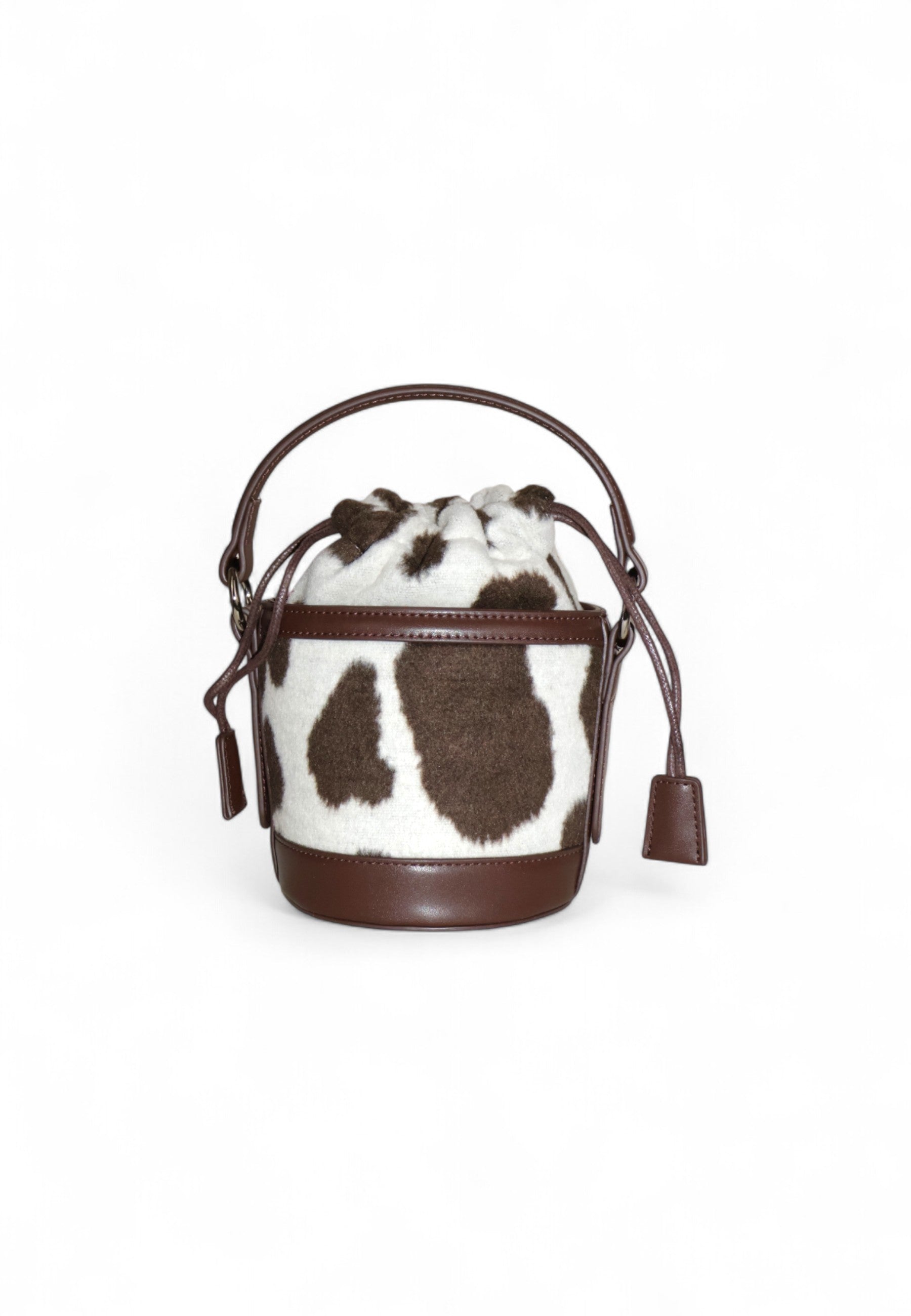 La fantasia muccata in bianco e marrone, arricchita da dettagli in ecopelle, dona un aspetto moderno e naturale, mentre il logo frontale iconico a contrasto sottolinea l’identità del brand con eleganza.
