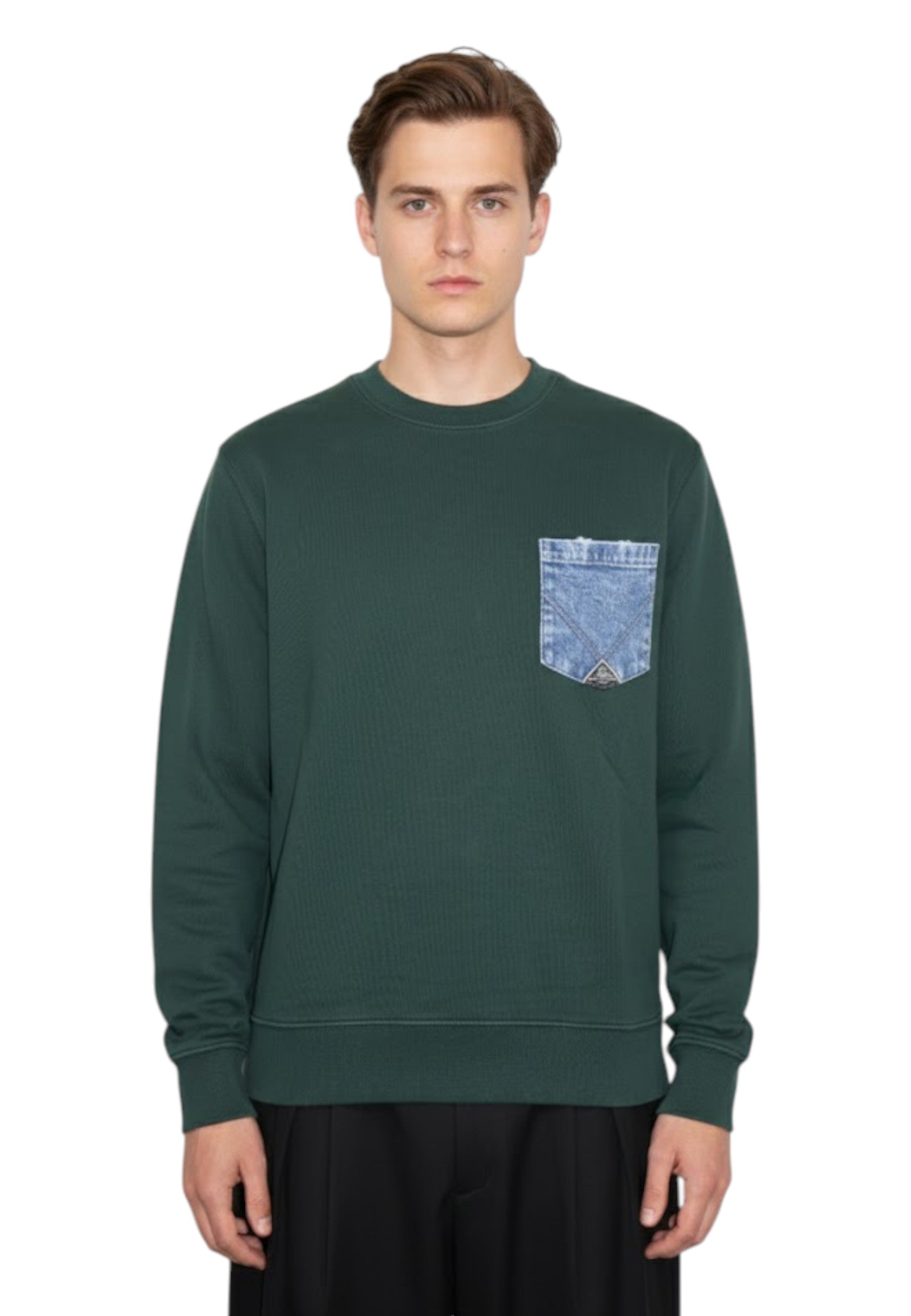 Con la sua tonalità verde scuro e il tocco di originalità dato dalla tasca in denim, questa felpa si distingue per il suo stile unico. Il materiale 100% cotone garantisce morbidezza sulla pelle e durata nel tempo, rendendo questo capo un investimento sicuro per il tuo guardaroba.