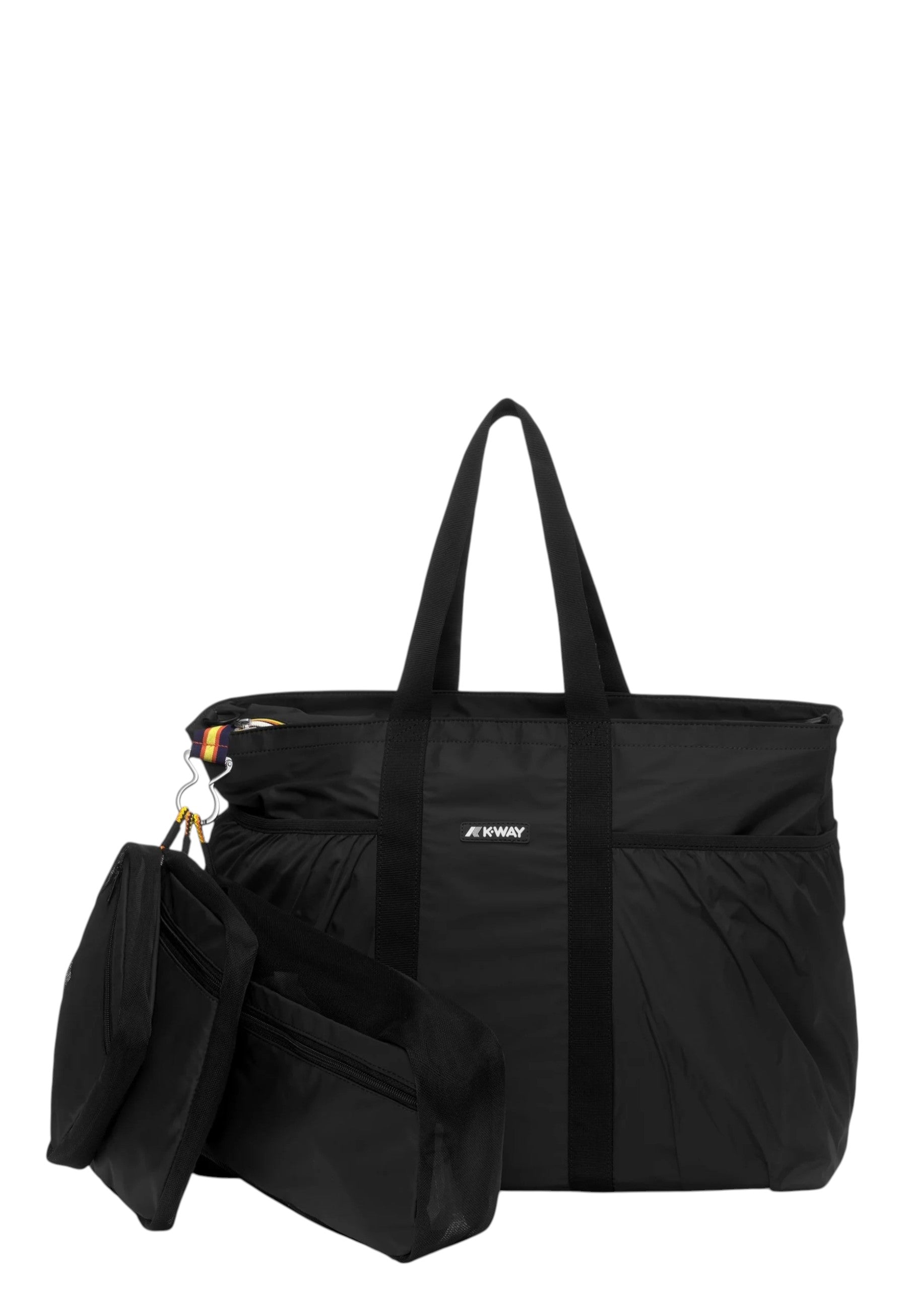 All’interno della borsa sono presenti tre pratiche pouch removibili, pensate per organizzare al meglio gli accessori: una dedicata ai prodotti body care, una per le ciabatte e una per il costume da bagno. Le bustine possono essere utilizzate anche separatamente, rendendo questa tote estremamente versatile. La chiusura con zip K-Way, le tasche laterali elastiche, gli scomparti interni multifunzionali e la maniglia portasciugamano completano un design studiato per la massima comodità. Dotata di manici in nastro e tracolla regolabile, la Saint Malo si adatta facilmente a ogni esigenza di trasporto. Il logo K-Way in silicone bianco firma un accessorio moderno e funzionale, perfetto per chi cerca una borsa mare capiente, impermeabile e organizzata.
