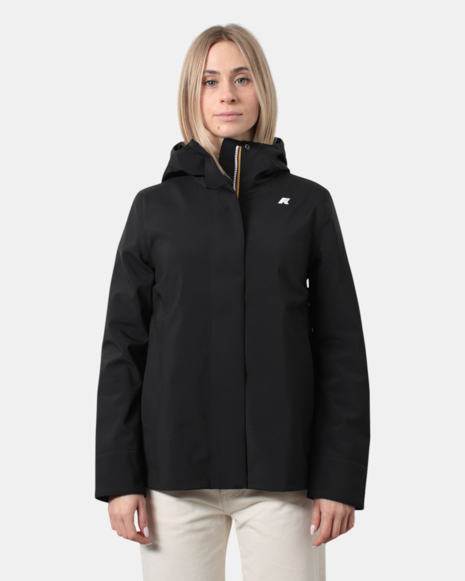 Il giubbotto a trapezio di K-Way presenta chiusura frontale con zip, due tasche frontali oblique con chiusura a zip nascosta, minilogo sul petto e maniche regolabili con chiusura a bottoni. Internamente è composto per il 100% da poliamide, esternamente per l'85% da poliestere e 15% poliuretano. Si consiglia lavaggio delicato a max 40 gradi. La modella è alta 1,65 m e indossa una M