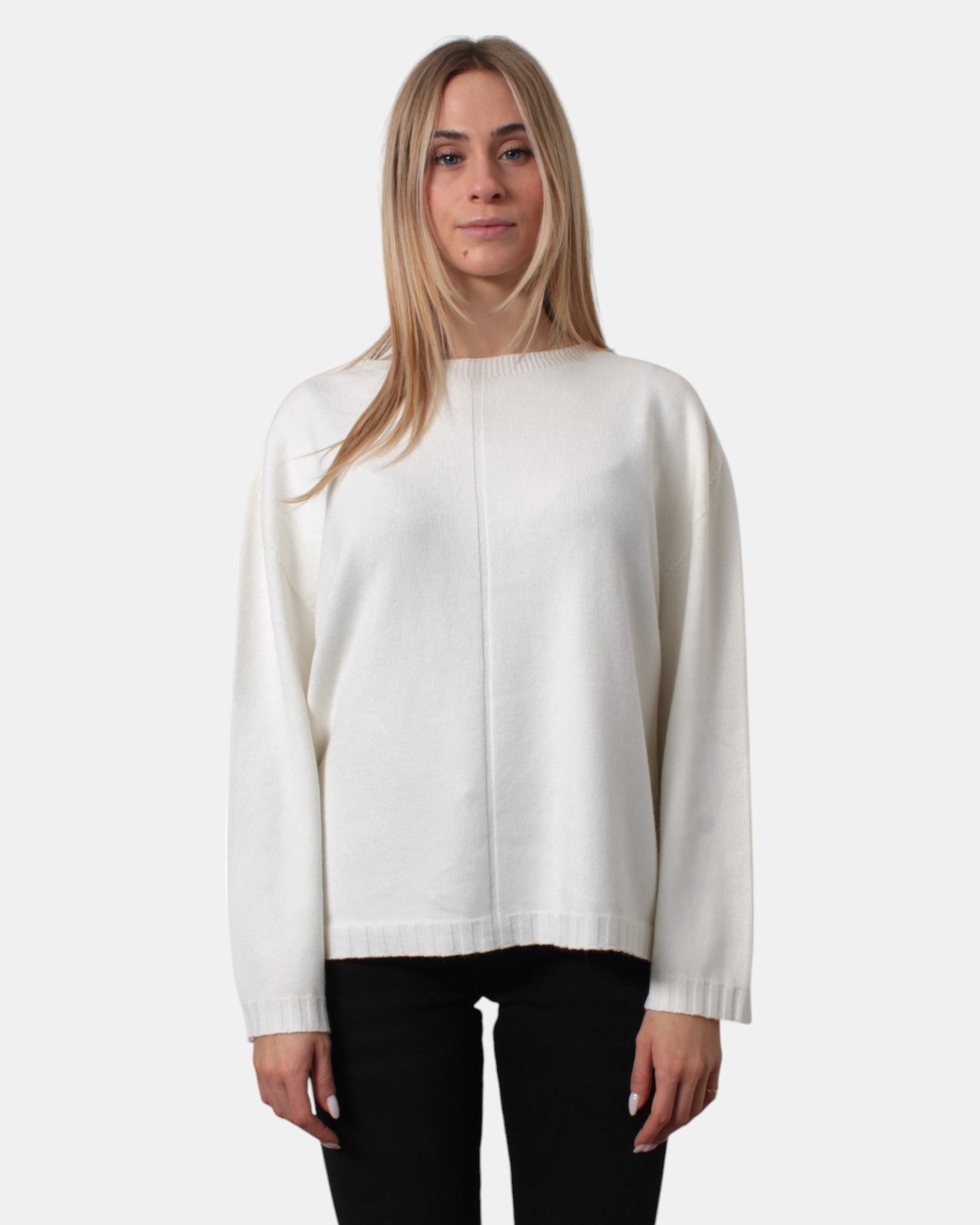 La maglia a girocollo di Solotre presenta collo, polsi e fondo a coste, e una striscia in tinta in rilievo al centro della parte frontale, dalla mano soffice e calda dovuta alla sua composizione in 65% viscosa, 27% poliestere e 8% angora. Si consiglia lavaggio a secco. La modella è alta 1,67 m e indossa una III