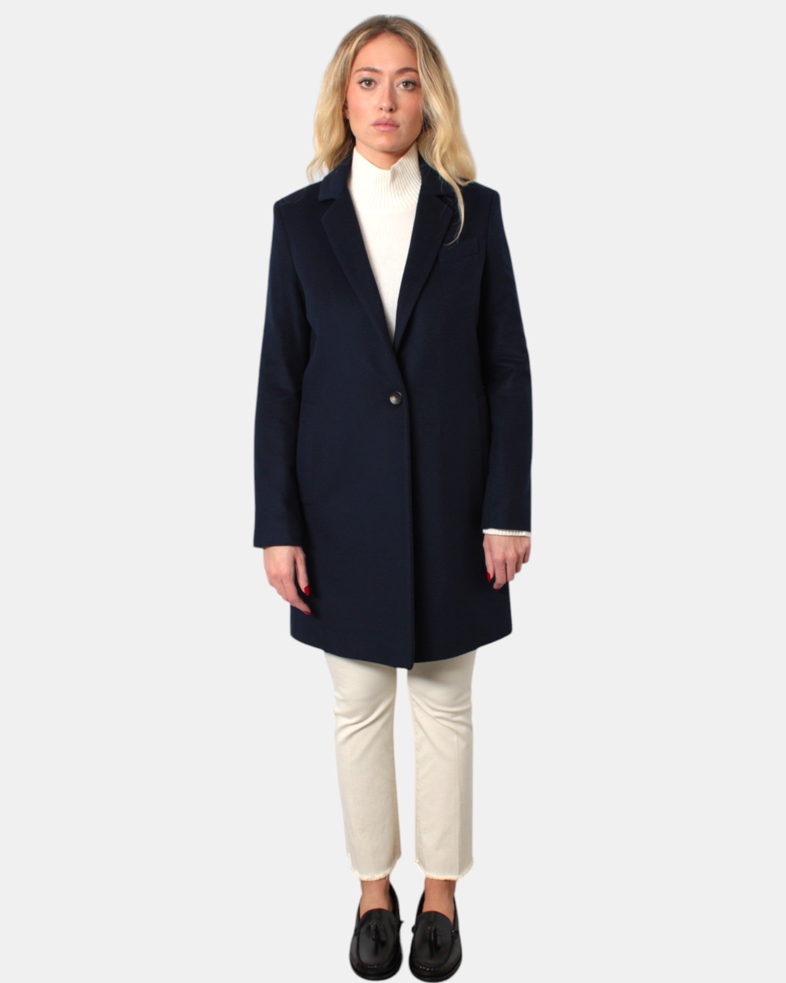 Il cappotto di ''ANNIEPARIS'' presenta monopetto un bottone, due tasche a filo laterali e un taschino sul petto, presenta vestibilità slim, caratterizzato da un tessuto corposo e caldo dovuto alla sua composizione in 70% lana vergine, 20% poliamide e 10% cashmere. Si consiglia lavaggio a secco. La modella è alta 1,70 m e indossa una 40
