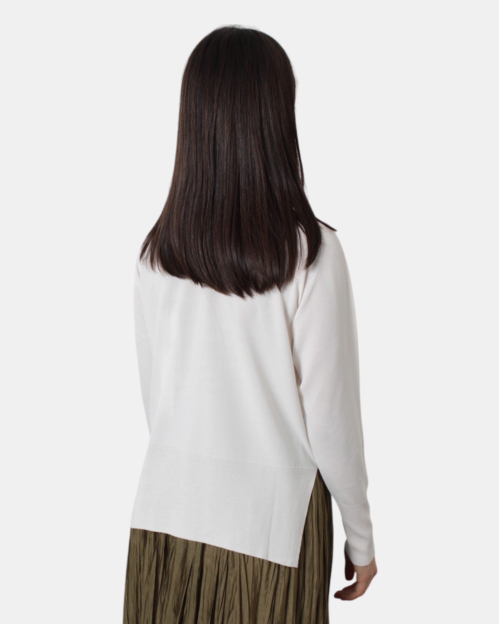 La maglia con collo a V di Solotre presenta collo, polso e fondo a costine, due spacchetti laterali, dalla mano fresca dovuta alla sua composizione in 65% viscosa e 35% poliammide. Si consiglia lavaggio a mano. La modella è alta 1,68 m e indossa una S.