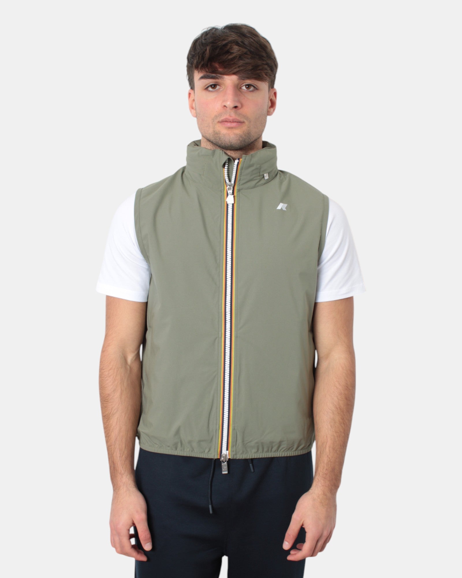 Il gilet di K-way presenta chiusura frontale con zip con dettaglio colori brand, tasche con zip, dalla mano fresca dovuta alla sua composizione in 76% poliestere e 24% poliuretano. Si consiglia lavaggio a massimo 30 gradi. Il modello è alto 1,78 m e indossa una M
