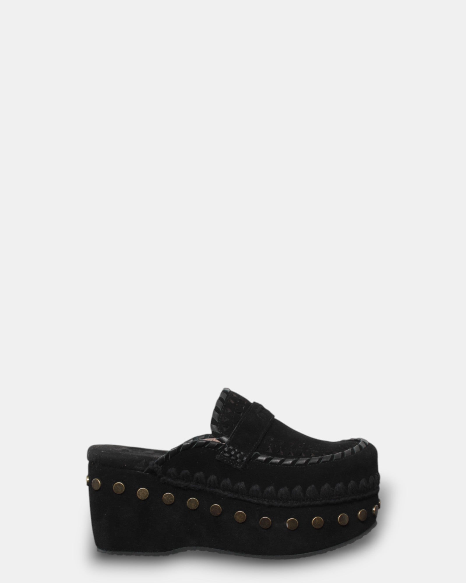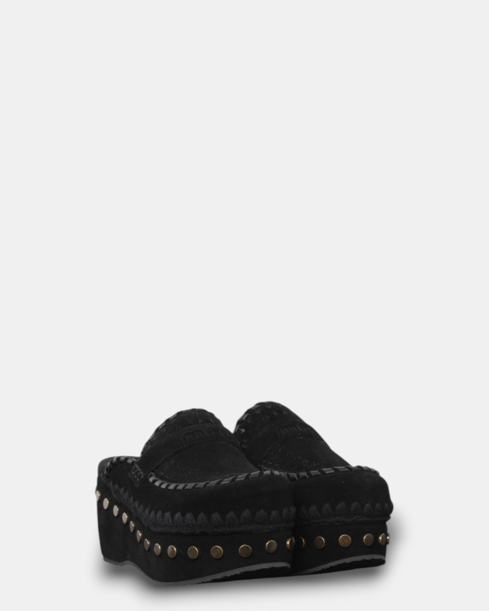 Il Summer Clog Overstitch di Mou è realizzato a mano in camoscio con cuciture all’uncinetto, borchie in metallo e soletta imbottita. Altezza zoccolo 6,7 cm.