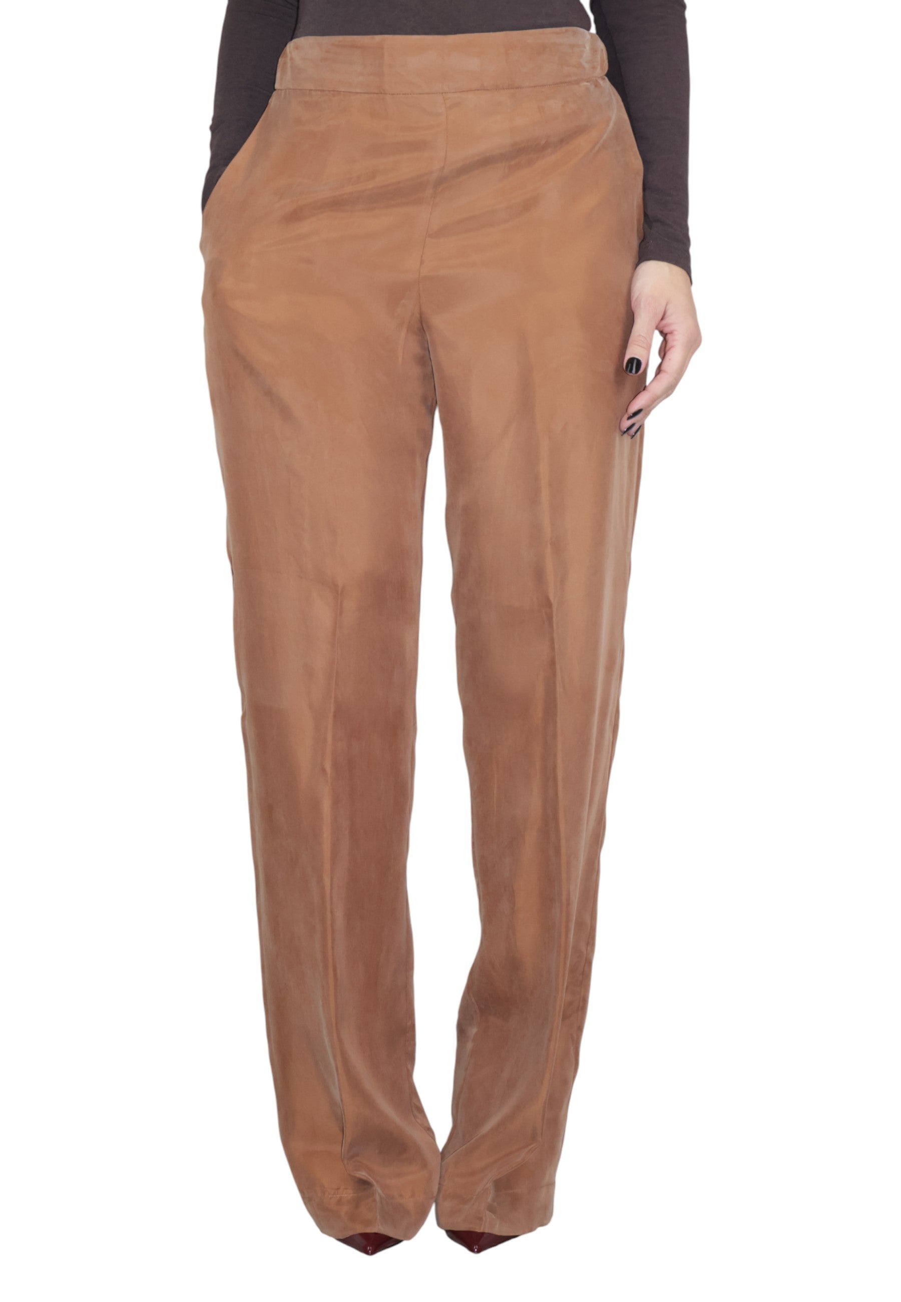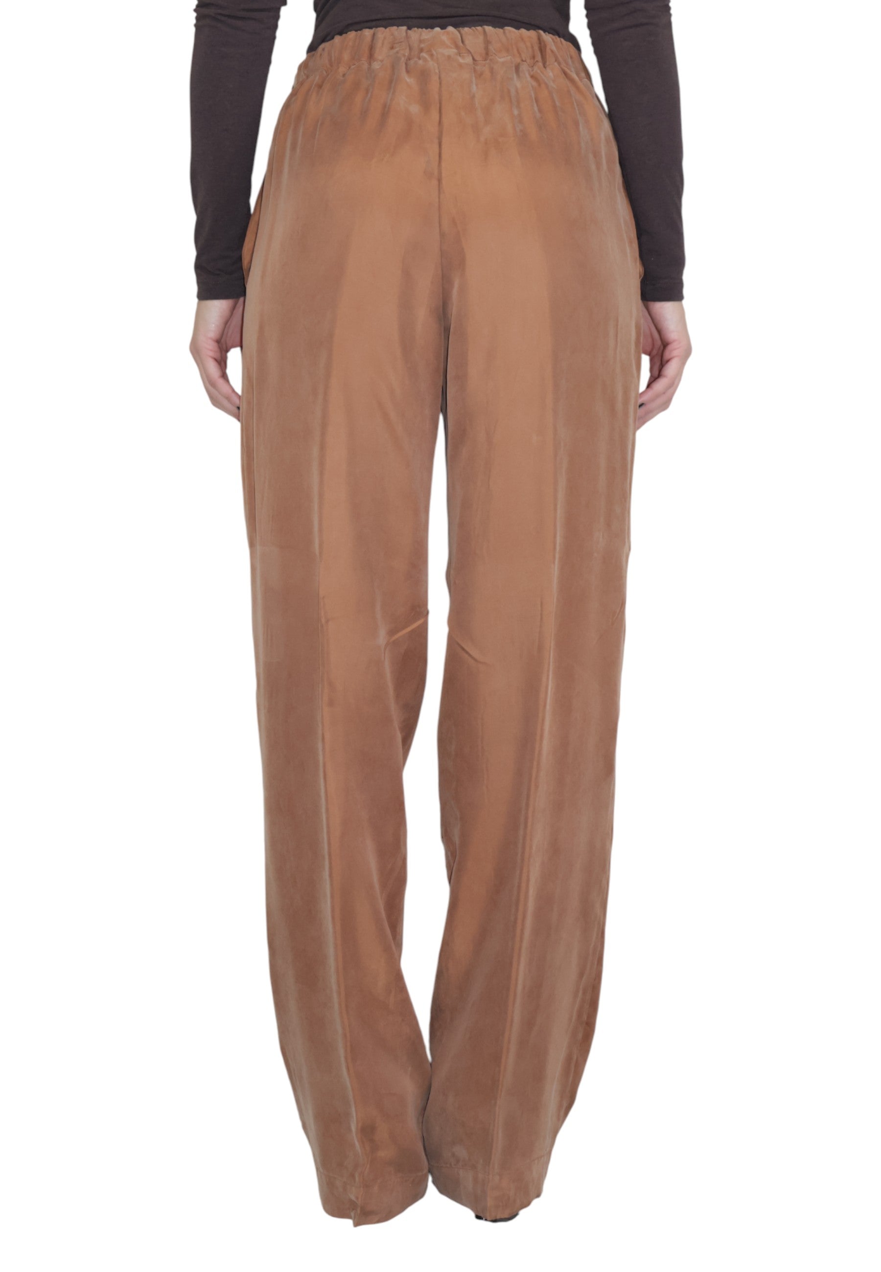Realizzati con una combinazione di cupro e viscosa, questi pantaloni offrono una sensazione di morbidezza e leggerezza insuperabile. La loro tonalità calda li rende facilmente abbinabili con altri capi, dalla camicia elegante alla maglia casual.