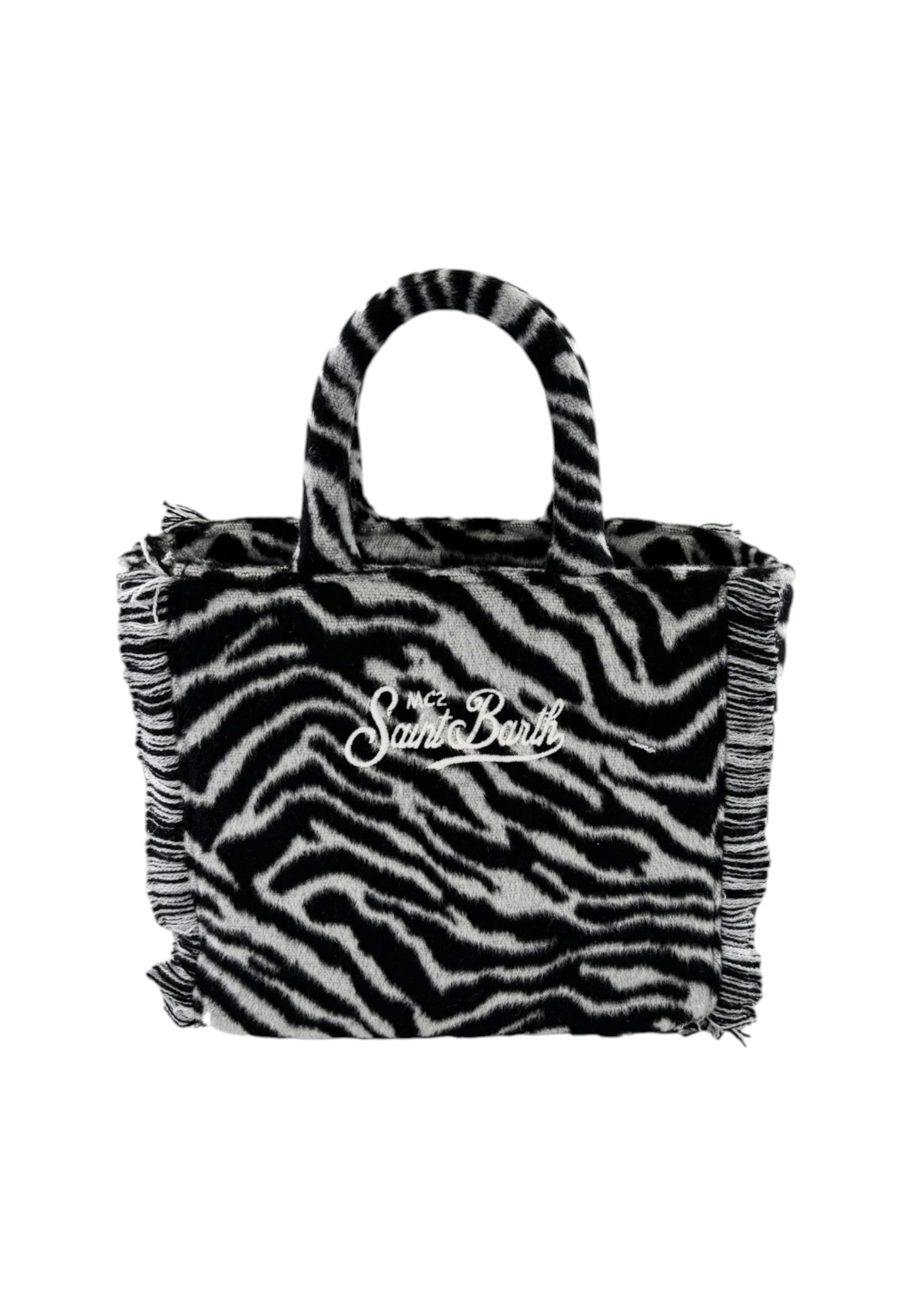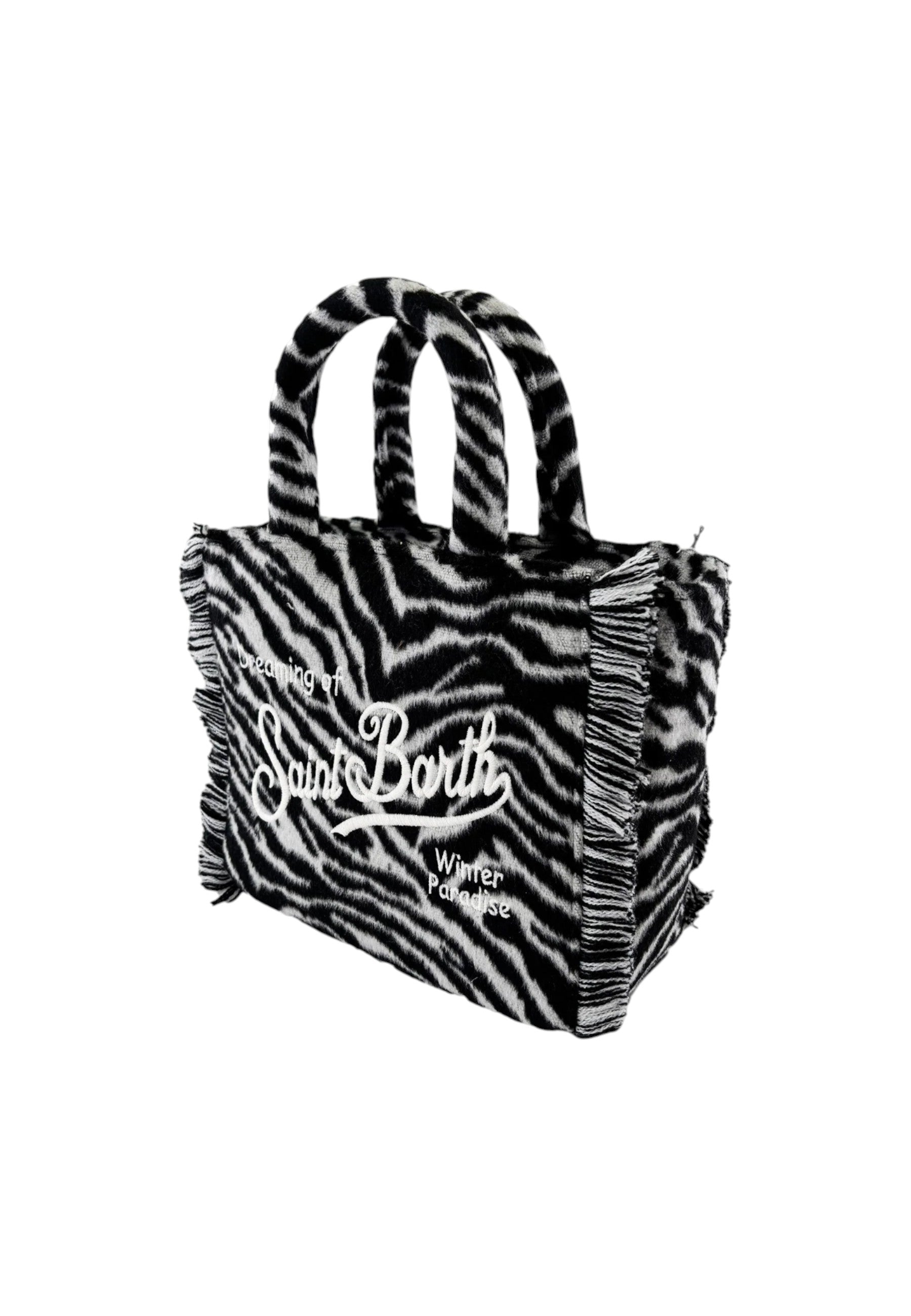 Realizzata in un morbido e raffinato tessuto teddy, presenta un vivace motivo zebrato e l'iconico ricamo Saint Barth sul fronte, simbolo distintivo del brand. I manici in ecopelle curati nei dettagli e la tracolla removibile offrono massima versatilità: portala a mano per un look chic, o a spalla per uno stile più casual.