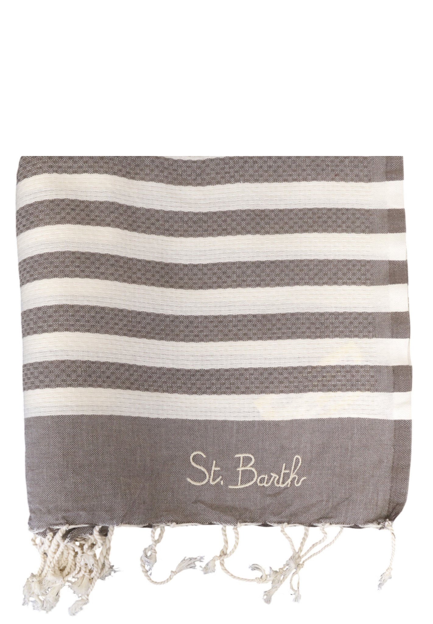 Il design essenziale è impreziosito dal ricamo esclusivo del logo St. Barth, dettaglio iconico che aggiunge un tocco distintivo e raffinato. Gli orli con frange completano il look con un richiamo allo stile mediterraneo, rendendo questo telo mare elegante e versatile anche come pareo o copritelo.