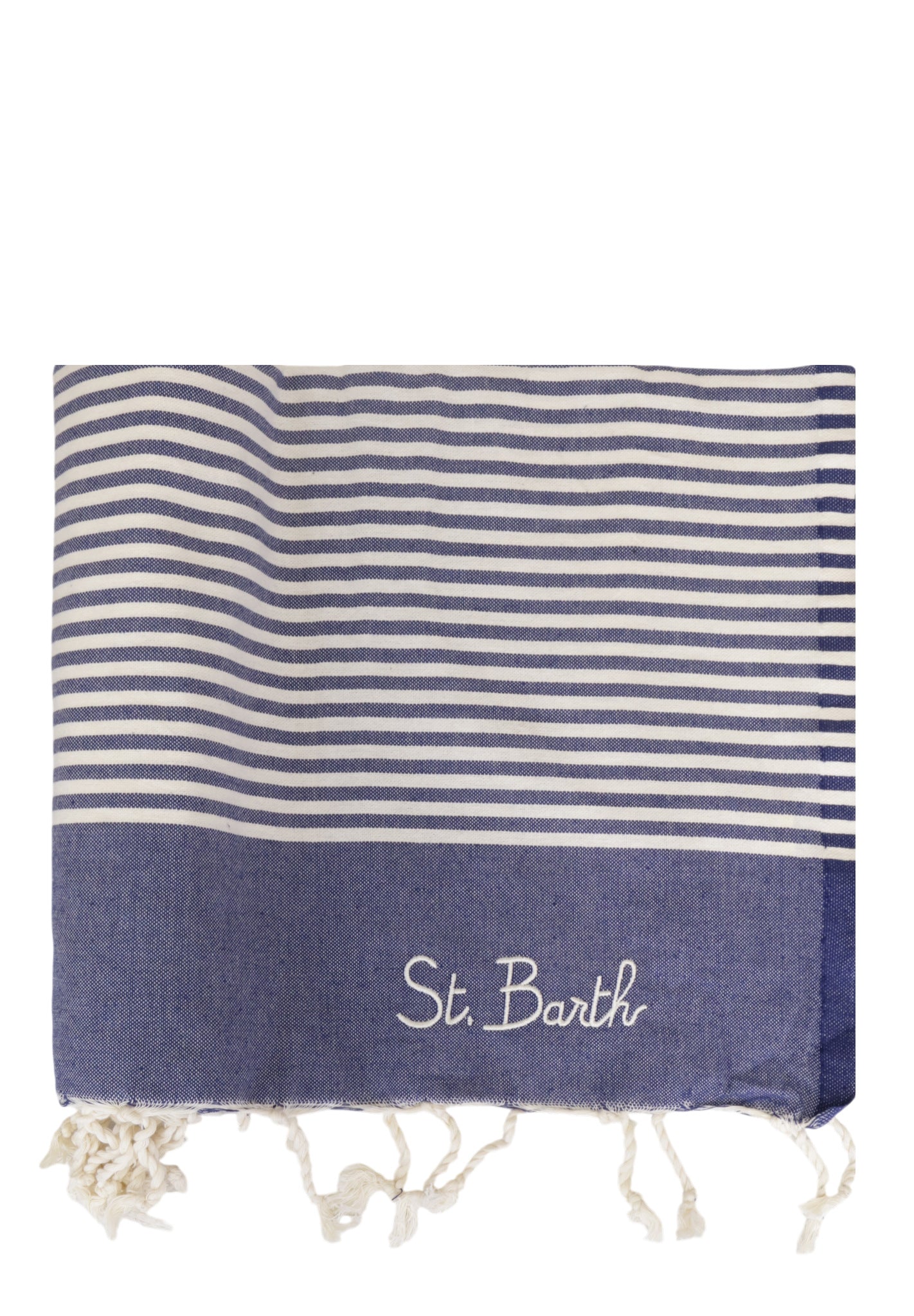 Il design essenziale è impreziosito dal ricamo esclusivo del logo St. Barth, dettaglio iconico che aggiunge un tocco distintivo e raffinato. Gli orli con frange completano il look con un richiamo allo stile mediterraneo, rendendo questo telo mare elegante e versatile anche come pareo o copritelo.