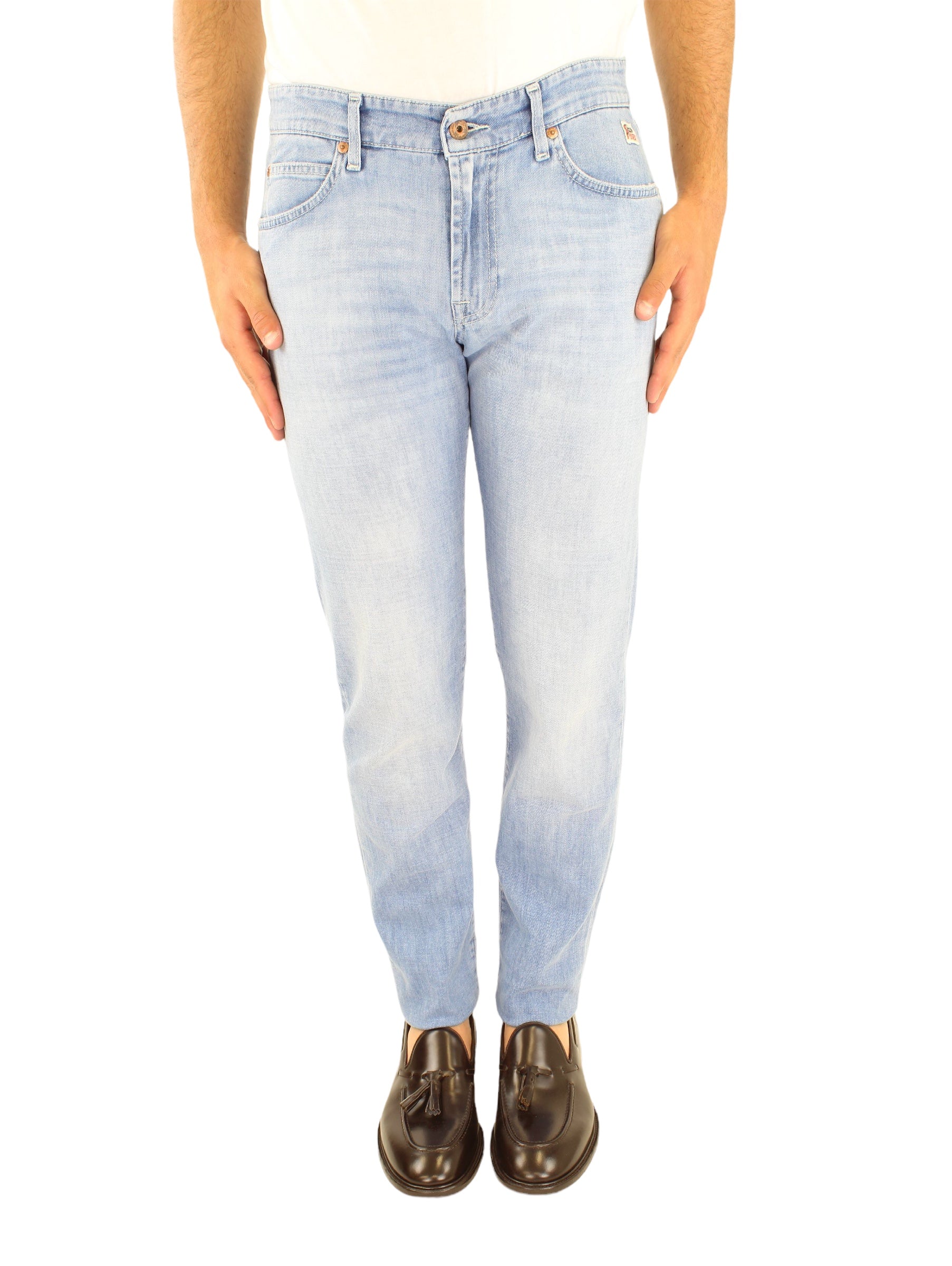 Il jeans di Roy Roger’s è realizzato in 99% cotone 1% elastane. Il modello denim è caratterizzato da chiusura con zip a scomparsa e bottone logato sul fronte, due tasche sul fronte e due tasche sul retro con logo. Si consiglia di lavare il capo a 40° in lavatrice. Il modello è alto 170 cm ed indossa una taglia 32.