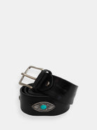 - DETTAGLI: realizzata in pelle, borchie, pietra colore turchese incastonata in un decoro inciso e fibbia in metallo color argento. Altezza: 3 cm. La misura della cintura indica la distanza tra il buco centrale e la fine della cinghia