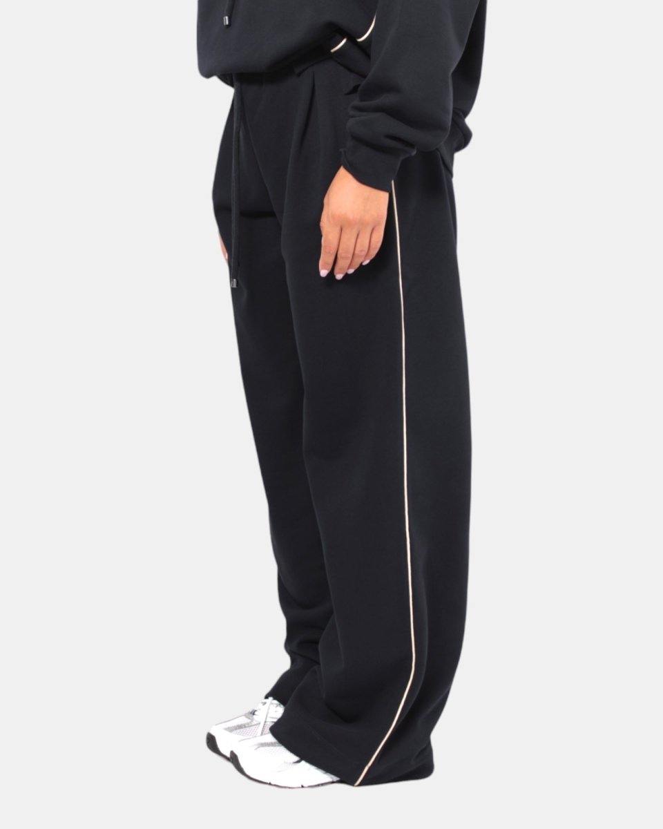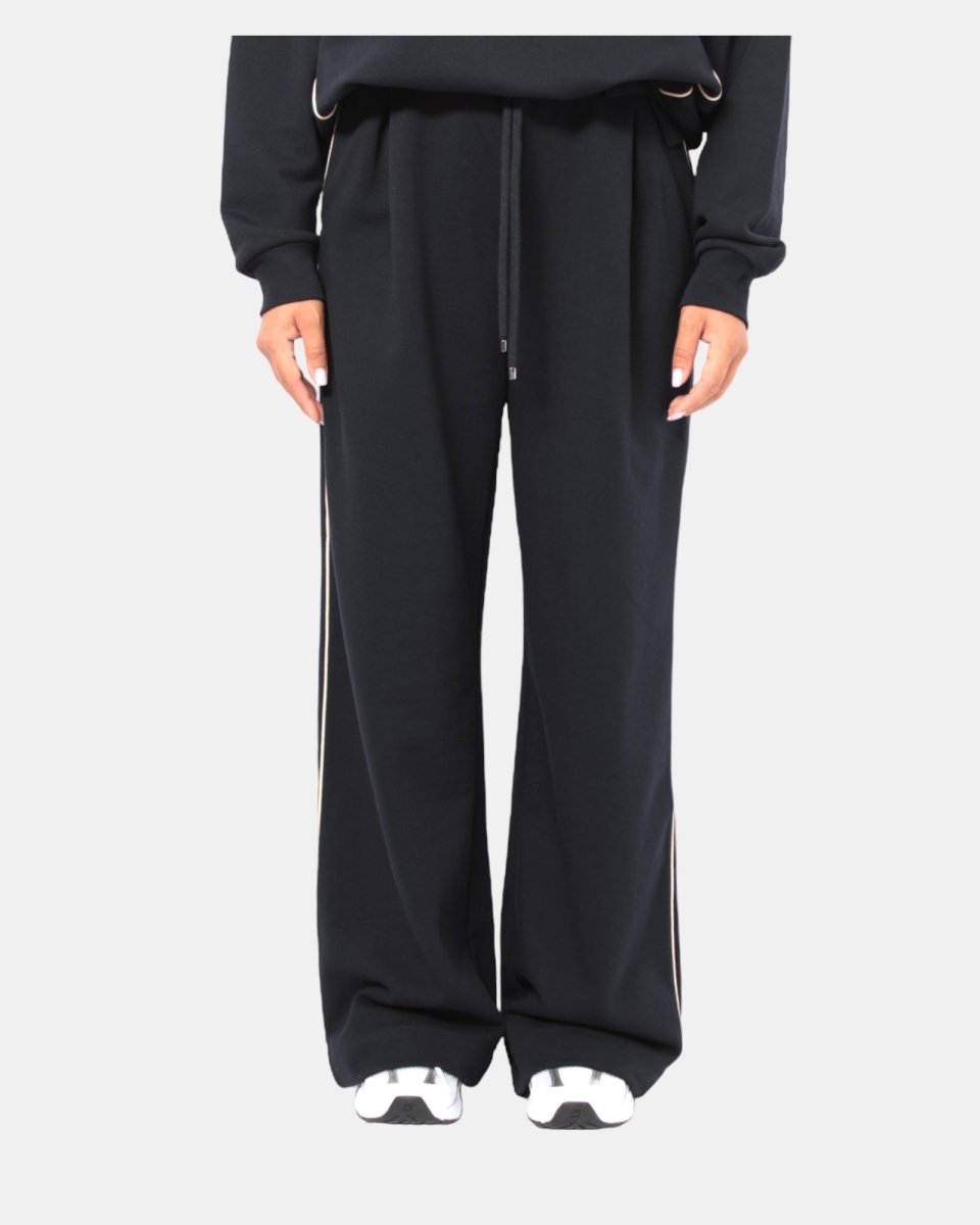 Pantalone tuta con elastico e coulisse in vita, pences e due tasche a filo, per un design pratico e versatile.