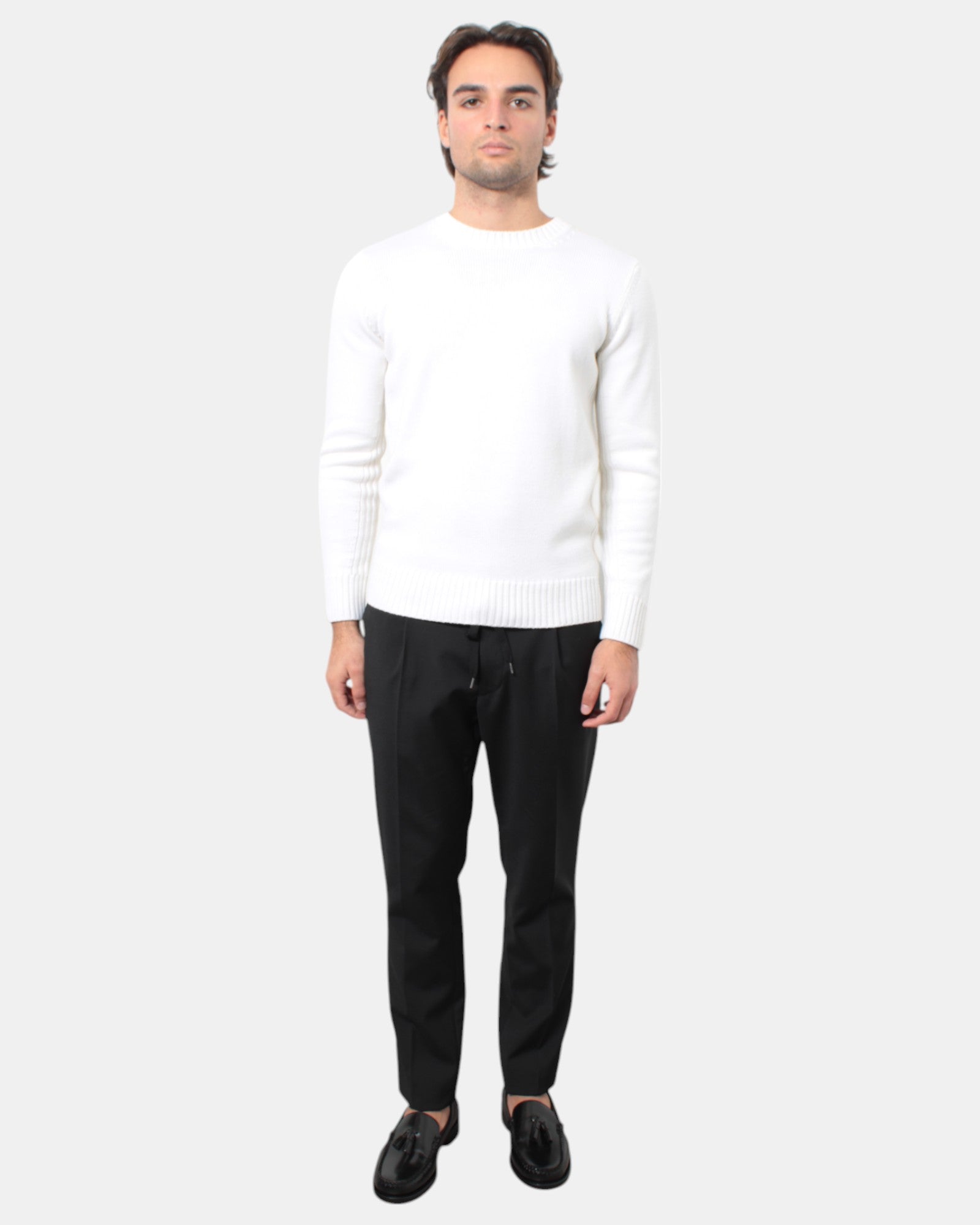 Il pantalone di Paolo Pecora presenta doppia pence frontale, due tasche america e due tasche a filo con bottone sul retro, chiusura frontale con zip e gancetto, dalla mano morbida dovuta alla sua composizione in 54% poliestere, 44% lana e 2% elastan. Si consiglia lavaggio a secco. Il modello è alto 1,80 m e indossa una 46