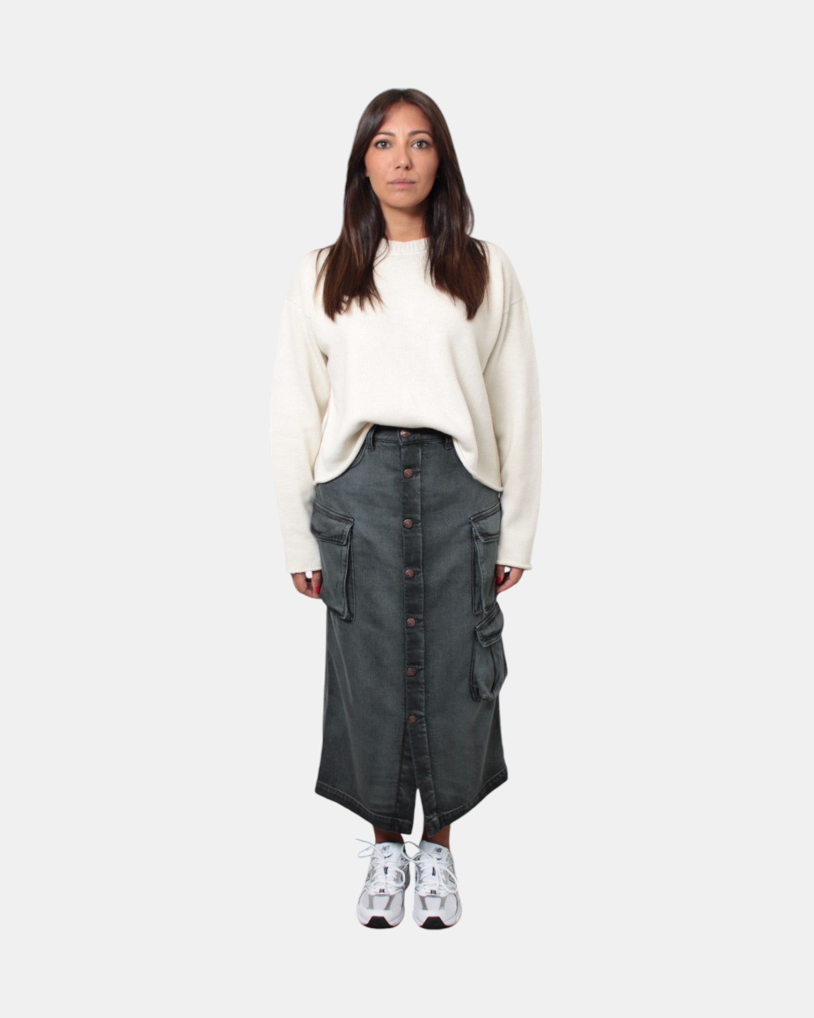 Modello: Gonna di jeans con abbottonatura frontale, un design classico che unisce praticità e stile. L'abbottonatura centrale non solo conferisce un aspetto elegante, ma permette anche una regolazione personalizzata per il massimo comfort.