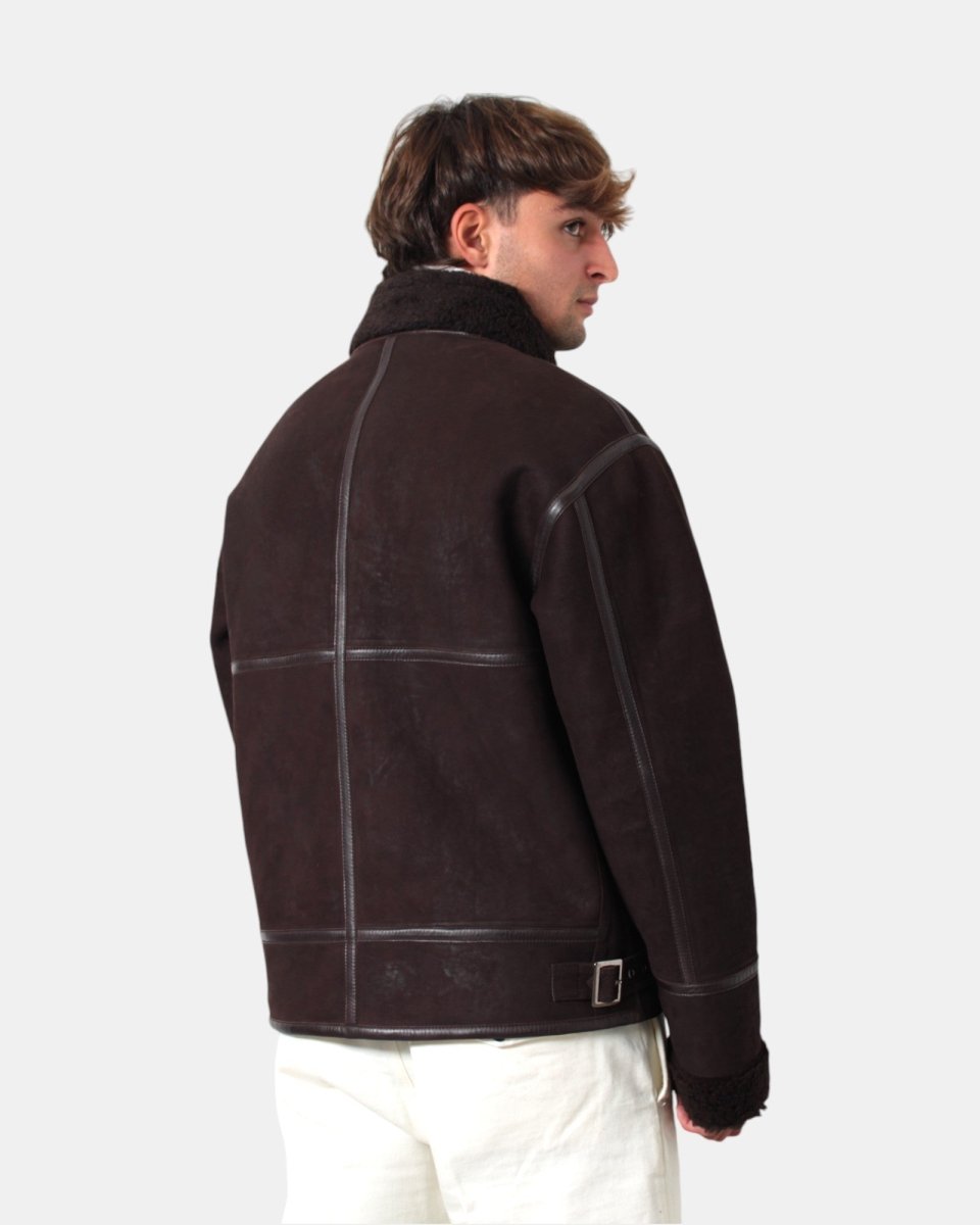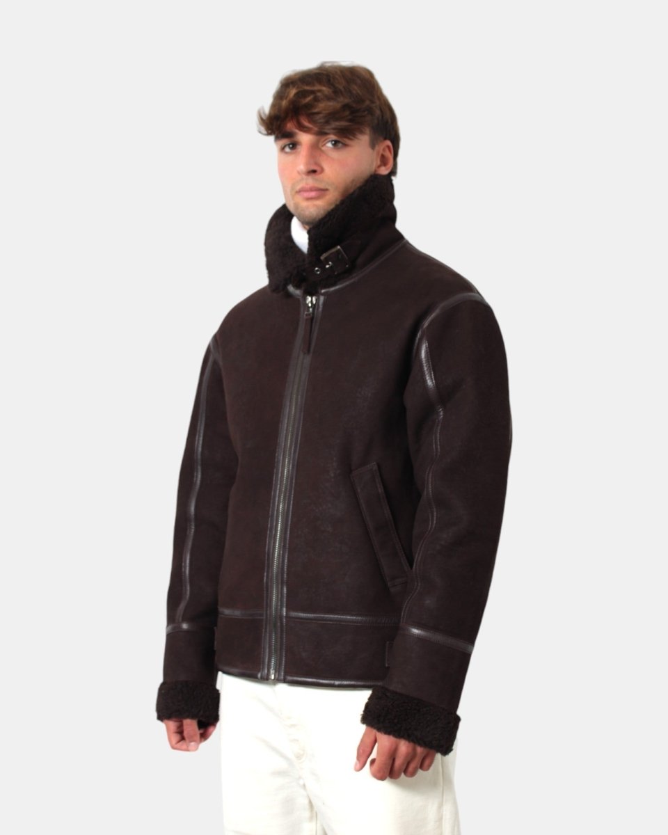 Lo shearling di Roy Rogers modello pilot presenta chiusura con zip, collo e polsi con pelo, due tasche laterali fondo dritto, con due cinghie laterali, il capo è in 100% pelle. Si consiglia il lavaggio in lavanderie specializzate. Il modello è alto 1,79 e indossa una 48