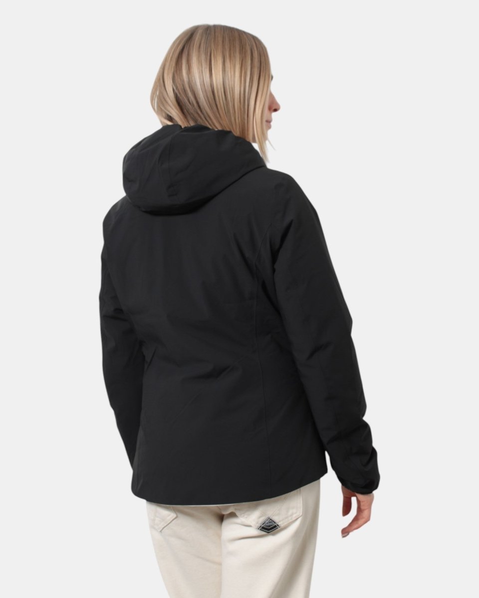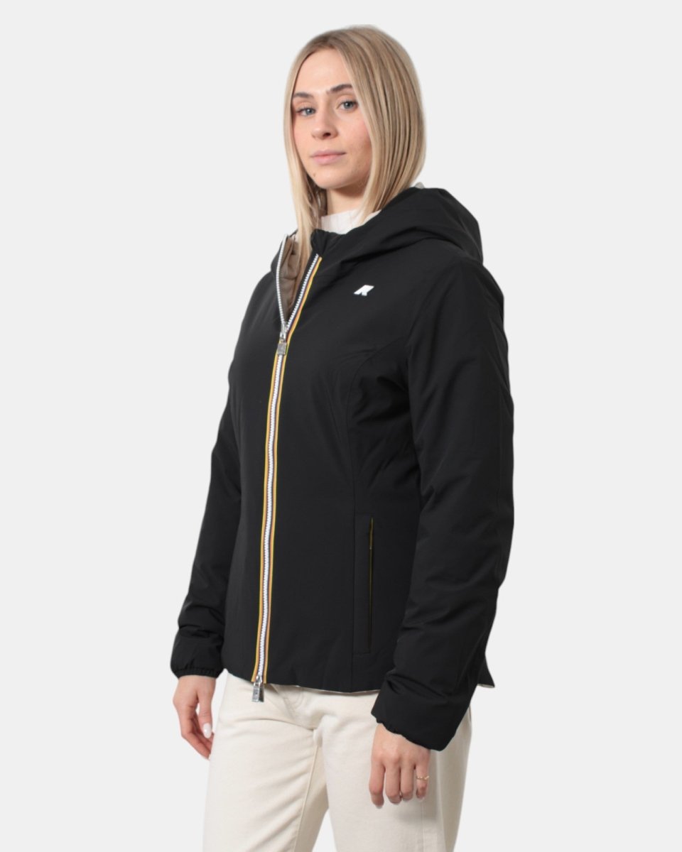 Il giubbotto reversibile di K-Way presenta chiusura frontale con zip, due tasche frontali oblique con chiusura a zip nascosta, minilogo sul petto e maniche con elastico. Internamente è composto per il 100% da poliestere, esternamente per il 92% da nylon e 8% elastan. Si consiglia lavaggio delicato a max 40 gradi. La modella è alta 1,65 m e indossa una L