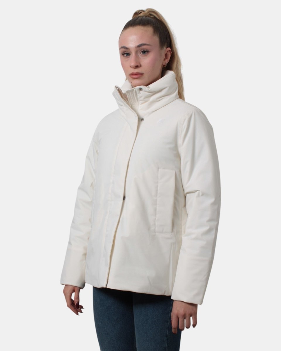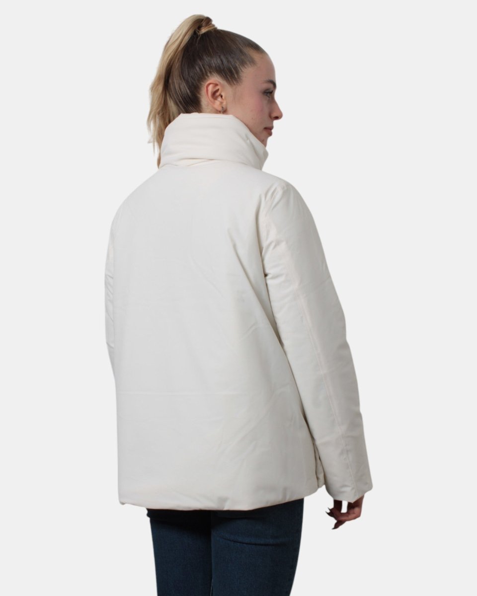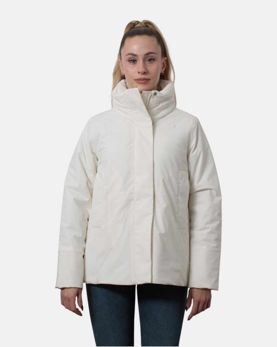 Il giccone di K-Way con collo presenta chiusura frontale con zip e bottoni a pressione, due tasche frontali oblique con chiusura a bottone e maniche con elastico. Internamente è composto per il 100% da poliammide e esternamente per il 92% da nylon e 8% elastan. Si consiglia lavaggio delicato a max 40 gradi. La modella è alta 1,65 m e indossa una M