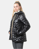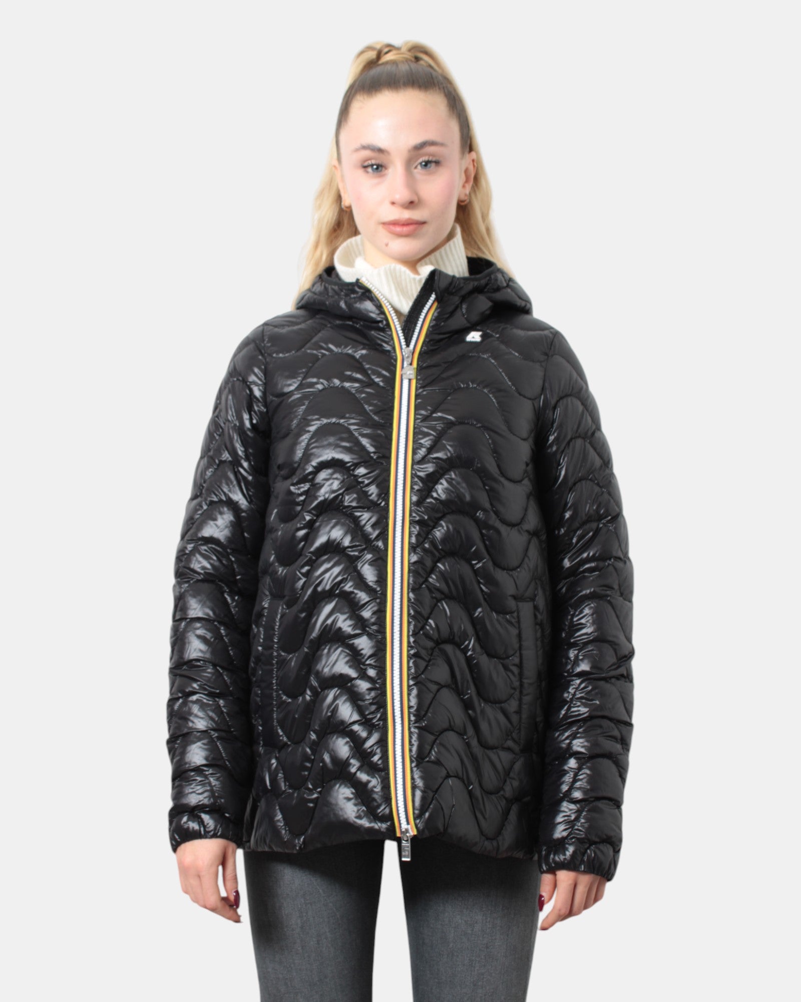 Il giubbotto modello Thermore con cappuccio di K-Way lucido presenta chiusura frontale con zip con losanghe ondulate, due tasche frontali oblique con chiusura a bottone e maniche con elastico. Internamente è composto per il 52% da poliammide e per il 48% da poliammide riciclato. Si consiglia lavaggio delicato a max 40 gradi. La modella è alta 1,65 m e indossa una L