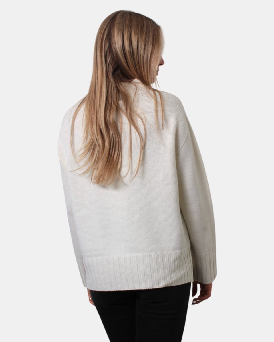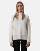 La maglia a collo alto di Solotre presenta collo, fondo e polsi a coste, due tasche frontali a toppa, vestibilità over, dalla mano calda in 100% lana. Si consiglia lavaggio a mano. La modella è alta 1,67 m e indossa una II