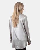 La camicia di Solotre presenta chiusura frontale a sette bottoni, maniche larghe con chiusura regolabile a tre bottoni, dall'effetto morbido dovuto dalla sua composizione in 92% seta e 8% elastan. Si consiglia lavaggio a secco. La modella è alta 1,67 m e indossa una M