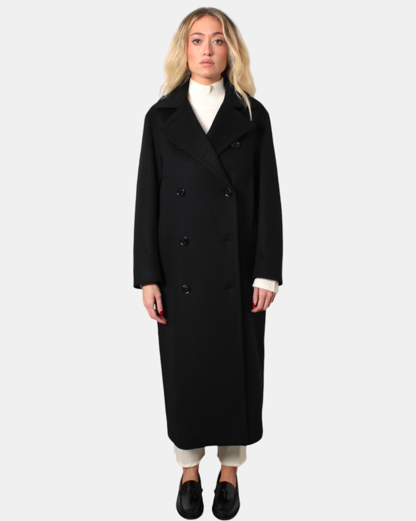 Il cappotto doppiopetto lungo di Breras a otto bottoni con rever classico presenta tasche a filetto laterali, composto in 100% lana vergine. Si consiglia lavaggio a secco. La modella è alta 1,70 m e indossa una 40