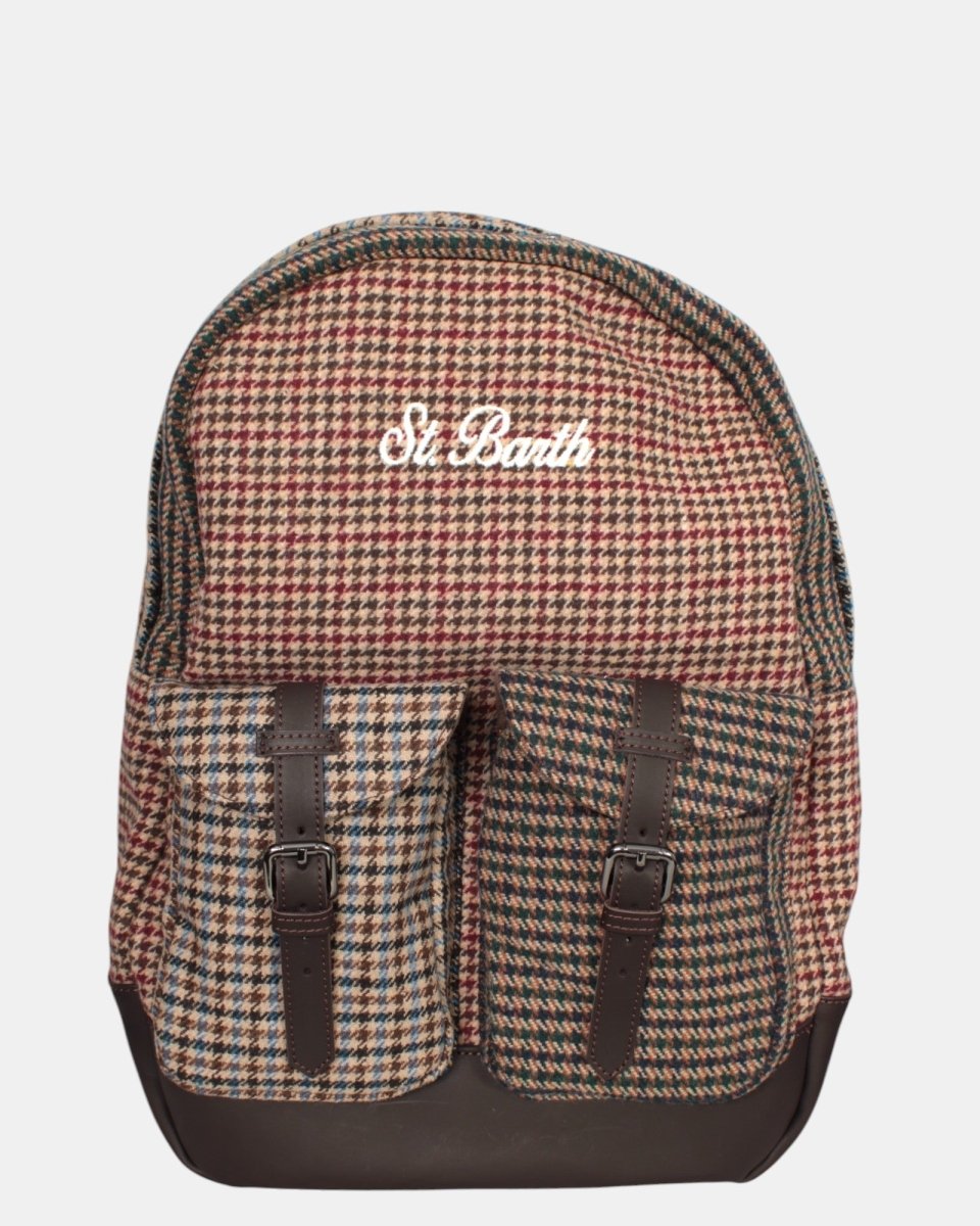 Lo zaino modello PIED DE POULE di MC2 Saint Barth presenta fantasia a quadretti esternamente, interno vellutato, presenta due tasche con chiusura a cinturino e logo brand cucito in contrasto, il fondo dello zaino è in pelle . Internamente presenta due tasche, una a rete e una ad elastico, la composizione dello zaino è 40% poliestere, 30% cotone e 30% lana .
