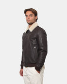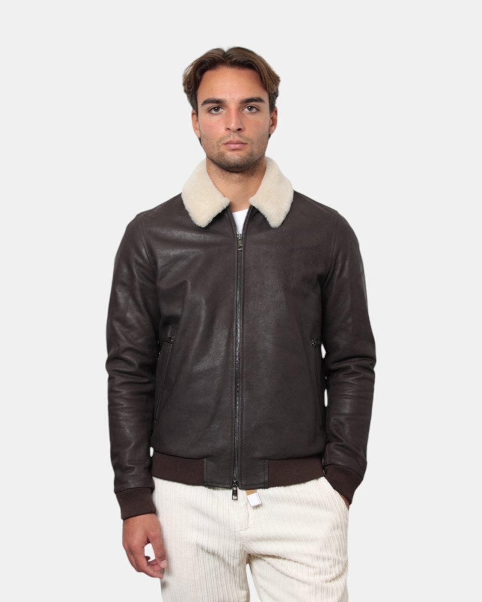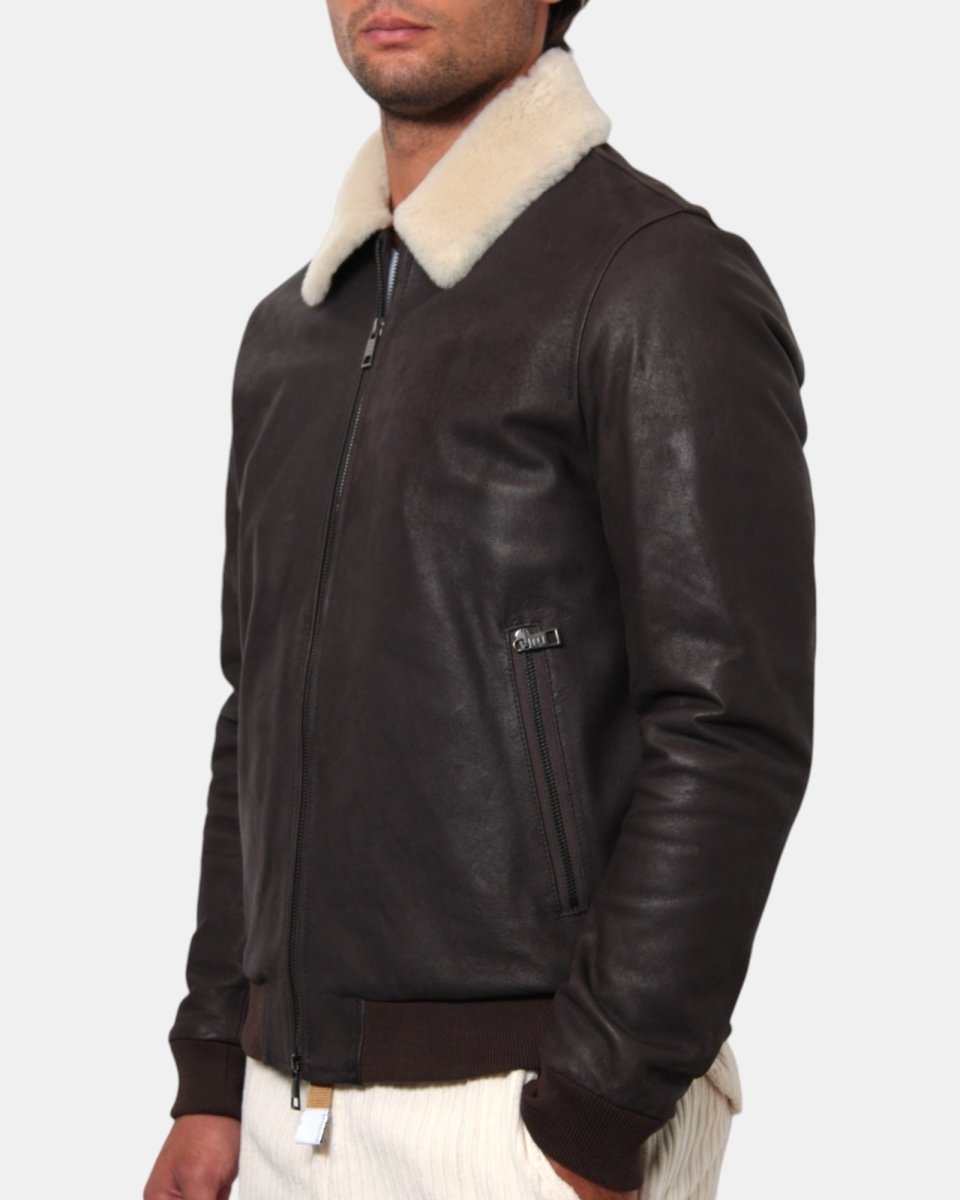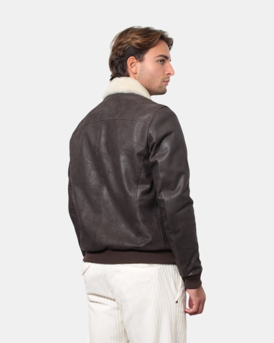 Dettaglio: Pelle nabuk testa di moro, con collo in eco pelliccia e finitura opaca che donano al giubbotto un aspetto elegante e distinto.