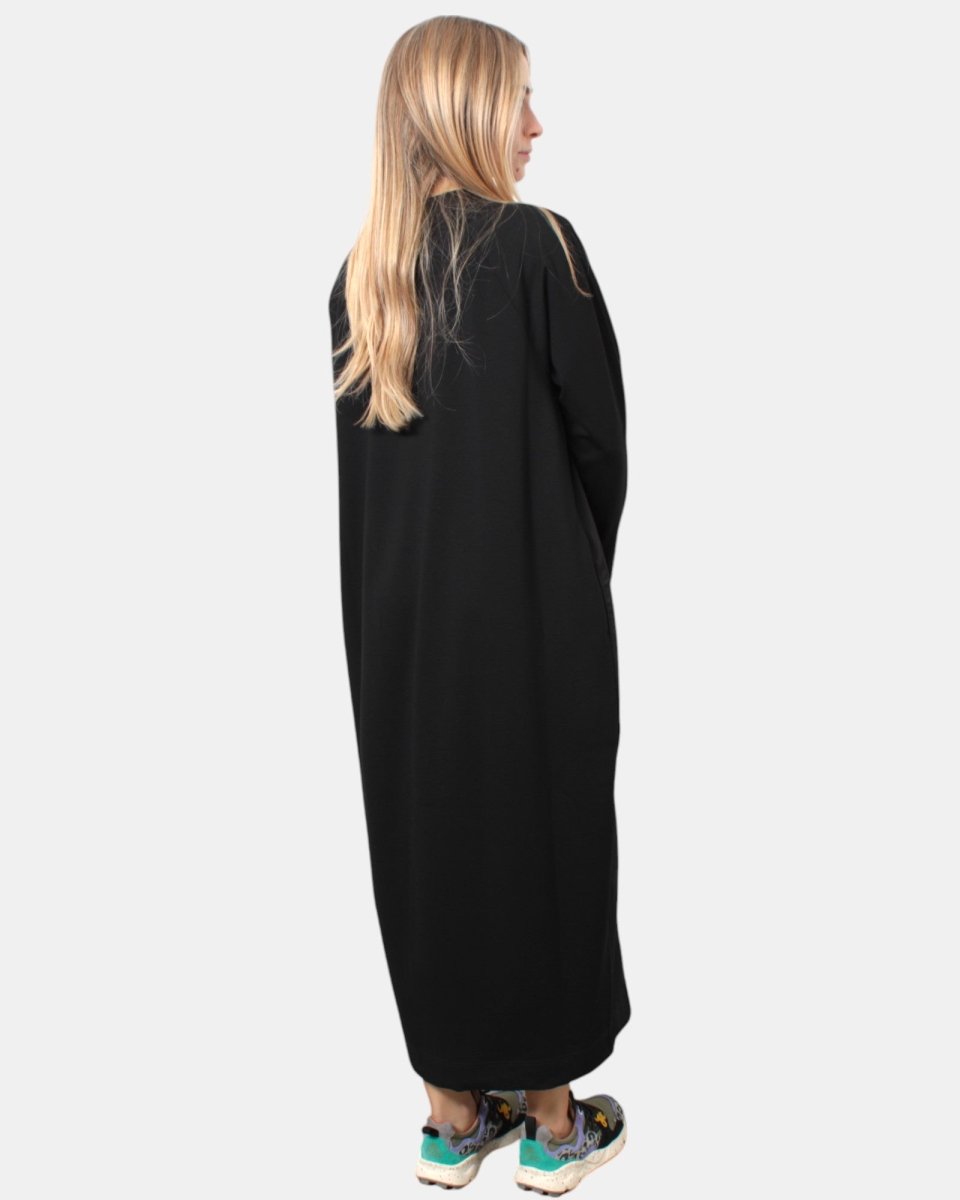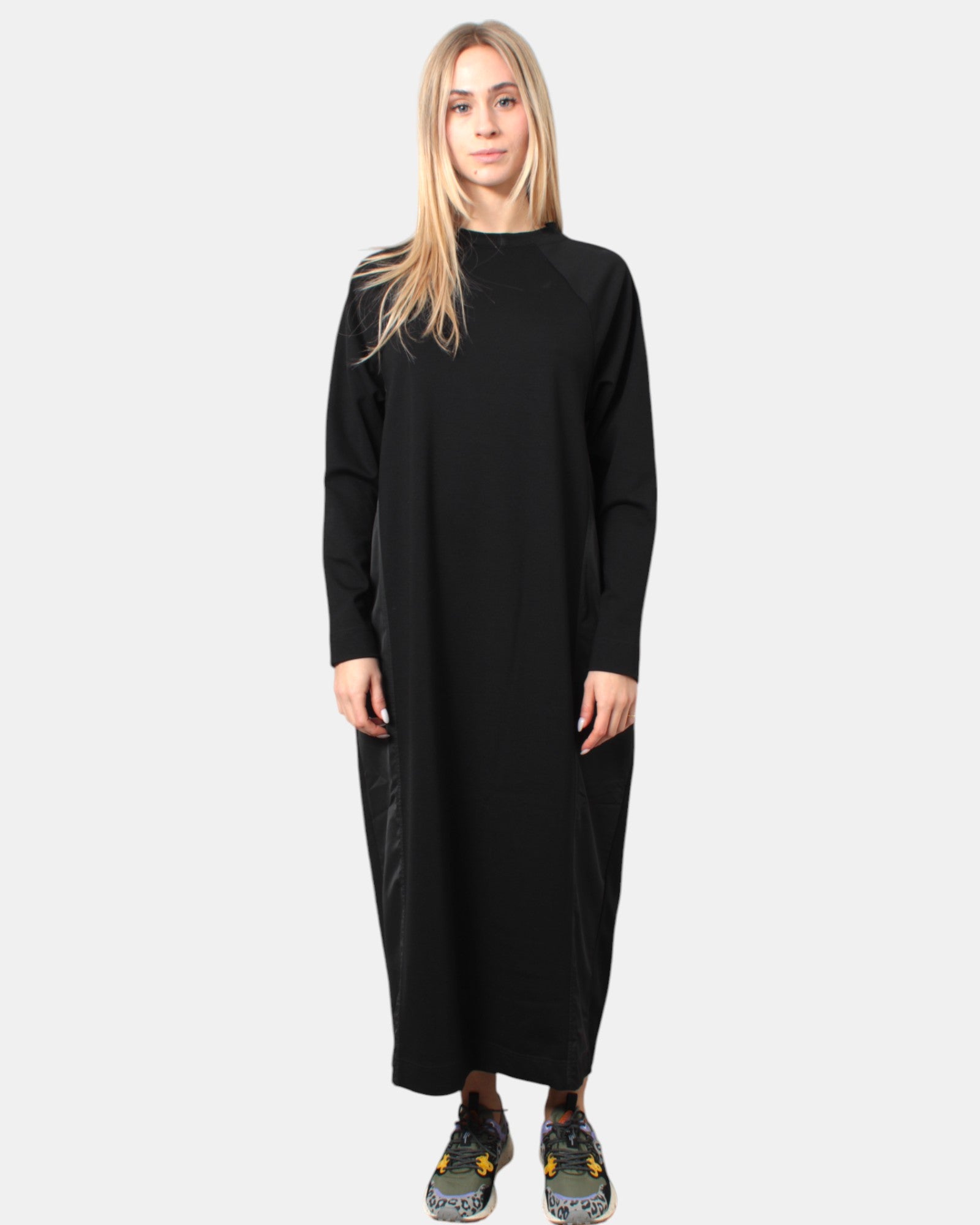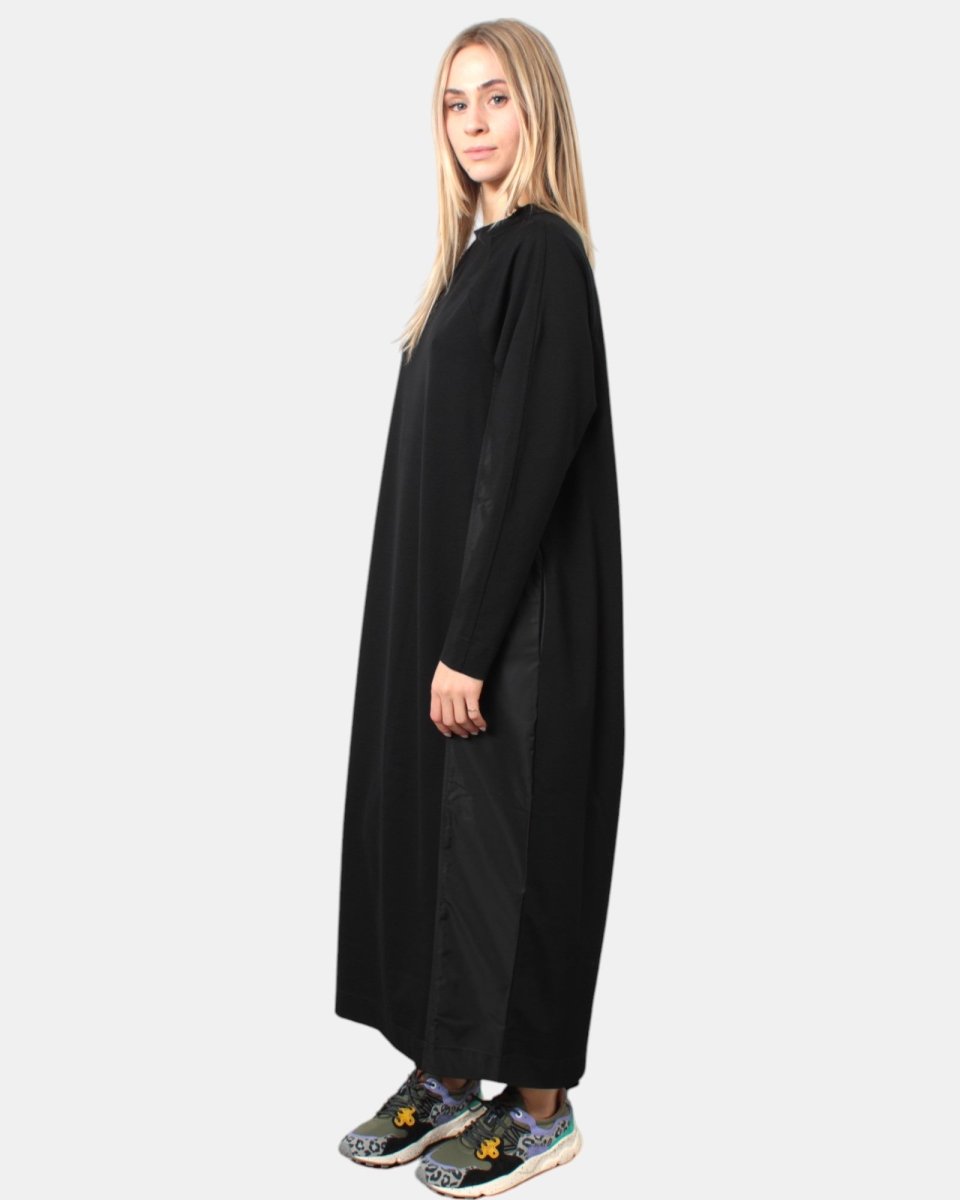 L'abito di Jijil over in jersey con tessuto tecnico in contrasto, presenta due tasche laterali ed è composta per il 65% viscosa, 30% poliestere e 5% elastan . Il secondo tessuto è composto per il 100% da poliestere. Si consiglia lavaggio a mano o a secco . La modella è alta 1,67 m e indossa una 40