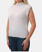 Il gilet in maglia a girocollo di Jijil con collo, fondo e giromanica a costine e con righe orizzontali in lurex su collo e giromaniche. La maglia dall'effetto peloso è molto calda e morbida per la sua composizione: 38 % poliamide, 35% mohair, 25% lana merino e 2% elastaine, la parte in lurex è per l'80% viscosa e 20% lurex. Si consiglia lavaggio a mano o a secco e stiratura a bassa temperatura. La modella è alta 1,67 m e indossa una 40