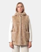 Il gilet con cappuccio di Leon&loulou in pelliccia sintetica presenta due tasche a toppa sul fronte, chiusura a gancetti frantale, si consiglia il lavaggio del capo a secco. La modella è alta 1,67 e indossa una L