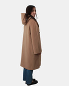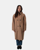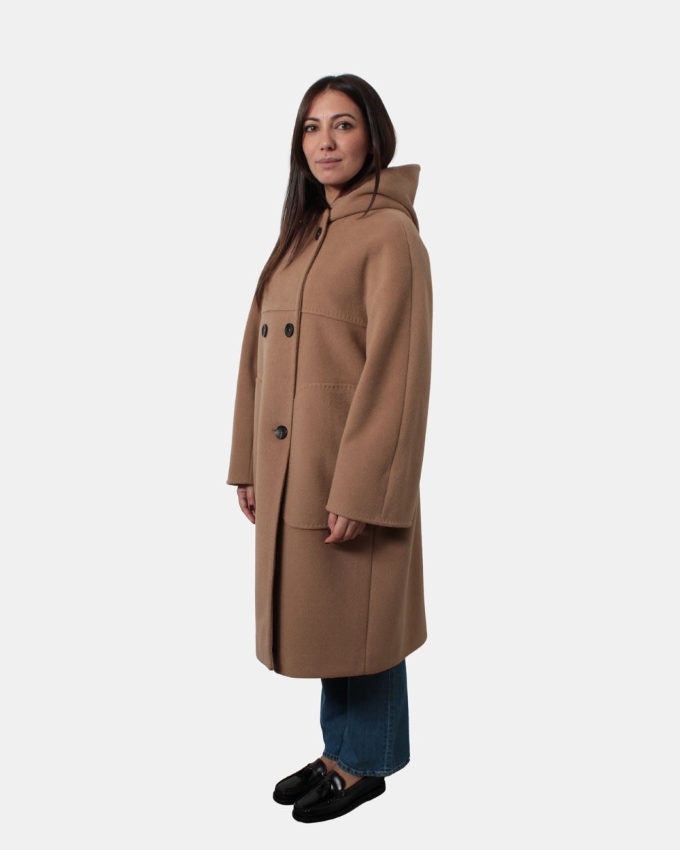 Il cappotto di Capani lungo doppiopetto a sei bottoni con cappuccio fisso, presenta due tasche a toppa a filetto, dalla sua composizione 90% poliestere e 10% viscosa. Si consiglia lavaggio a secco . La modella è alta 1,70 m e indossa una 40