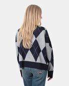 La maglia a girocollo di Jei-o presenta fantasia a rombi, collo, fondo e polsi a costine, con giro sceso. La sua composizione è per il 50% lana e 50% acrilica. Si consiglia lavaggio a mano. La modella è alta 1,67 m e indossa una M