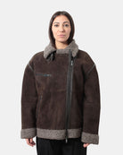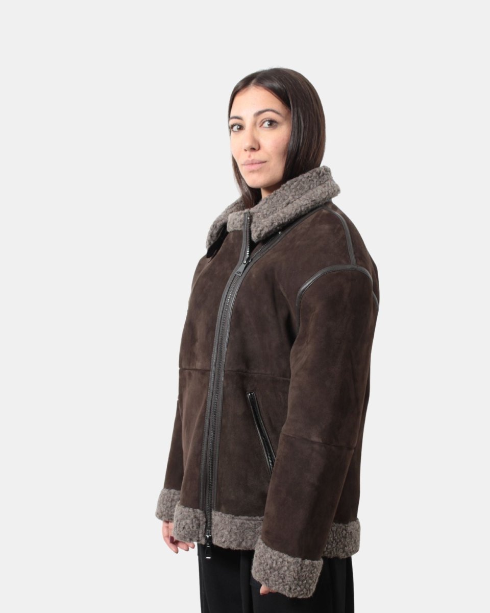 Lo shearling di The Jackie presenta chiusura con zip decentrata, con due tasche laterali oblique con zip e una tasca orizzontale superiore. Collo, polsi e fondo in contrasto di tessuto. La composizione esterna è in vera pelle, quella interna è 50% poliestere, 45% lana e 5% altre fibre. Si consiglia lavaggio in lavanderie specializzate. La modella è alta 1,67 m e indossa una 40